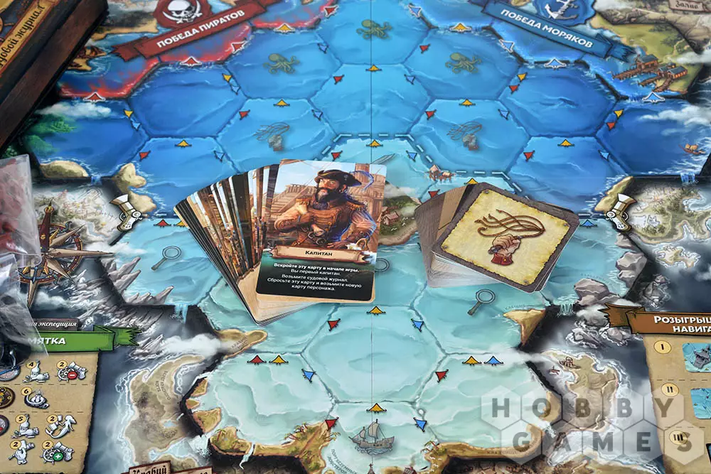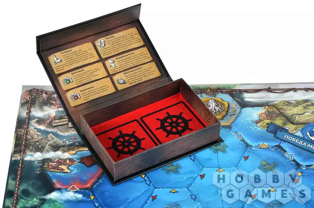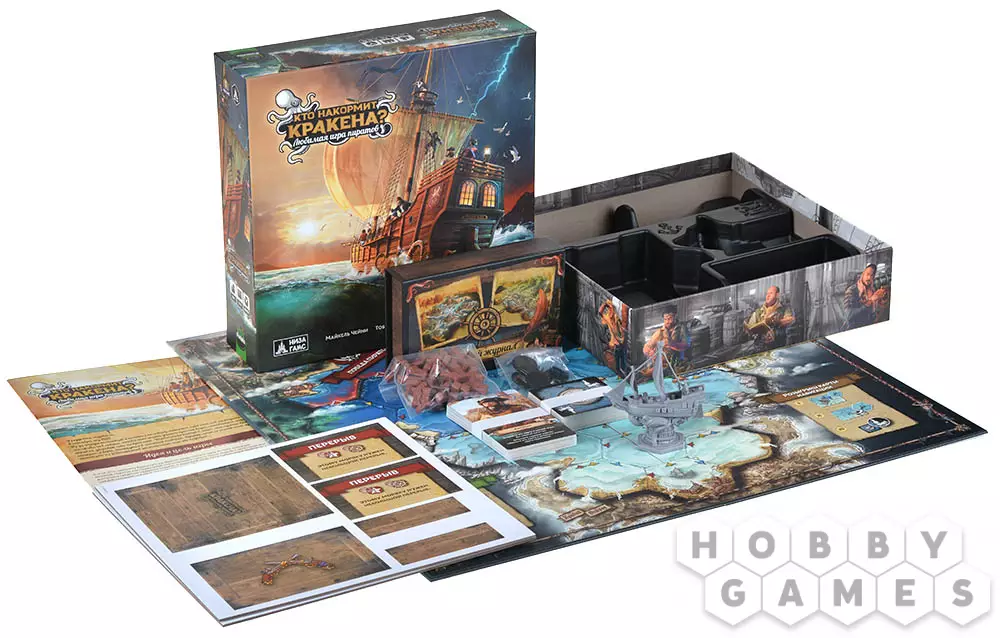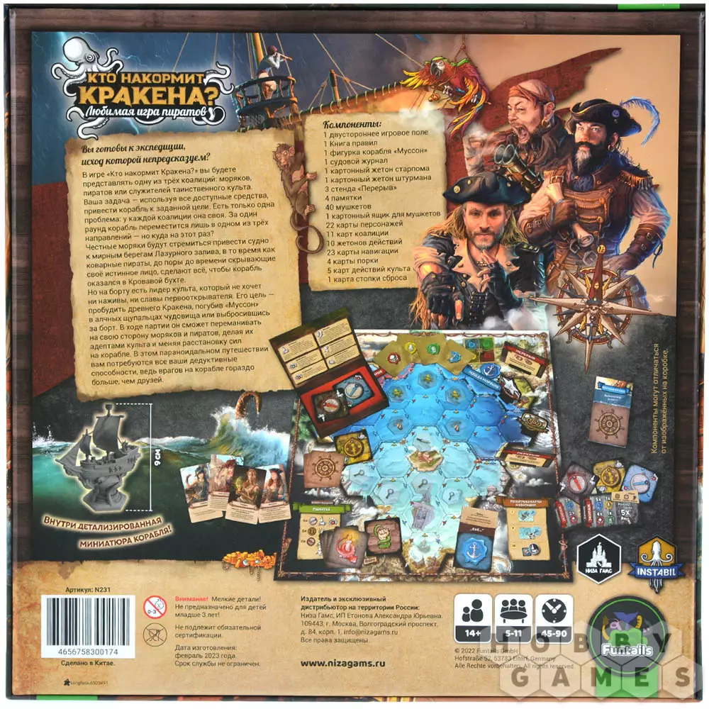 "Кто накормит Кракена?" – это атмосферная настольная игра для большой компании, в которой вам предстоит проверить свою социальную дедукцию. Все вместе вы отправляетесь в экспедицию на корабле "Муссон", вот только ваша команда весьма разношёрстна. Каждый игрок станет сторонником одной из трёх фракций: моряки, пираты и служители таинственного культа. Однако никто не будет знать, кто кем является. В этом и кроется основная задача каждого игрок – вычислить предателя и понять, кому можно доверять. У каждой стороны команды своя цель – привести корабль в конкретное место. А для этого нужно управлять навигацией корабля. Каждый раунд 3 новых игрока будут становиться капитаном, штурманом и старпомом, которые и зададут направление движения. Сможете ли вы привести корабль в назначенное место, приведя свою команду к успеху и не оказаться за бортом? Проверьте это!