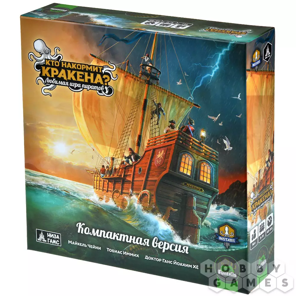 "Кто накормит Кракена?" проверит вашу социальную дедукцию и прекрасно развлечёт большую компанию. Ваша задача – повернуть корабль в нужном вам направлении. Честные моряки стремятся в Лазурный залив, коварные пираты – в Кровавую бухту. А третий игрок, тёмная лошадка, желает разбудить Кракена – и для этого ему нужно пожертвовать кем-то из экипажа или затопить судно, сделав его подношением чудовищу. Вас ждут заговоры, интриги, предательства и жаркие споры – скучно не будет! Сражайтесь за выживание, но не забывайте – Кракен не дремлет!