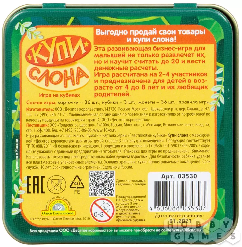 "Купи слона" – это простая настольная бизнес-игра на кубиках для малышей, которая поможет вам научить вашего ребёнка простому счёту до десяти, а также даст представление о том, что такое денежные расчёты.