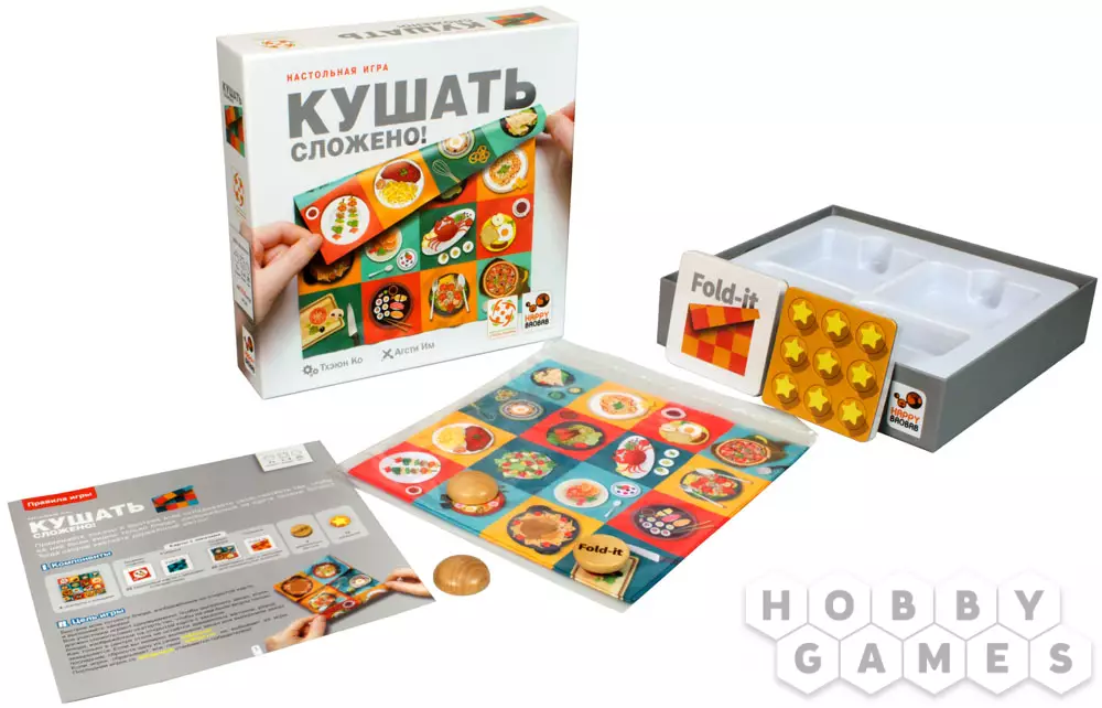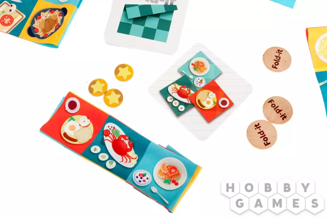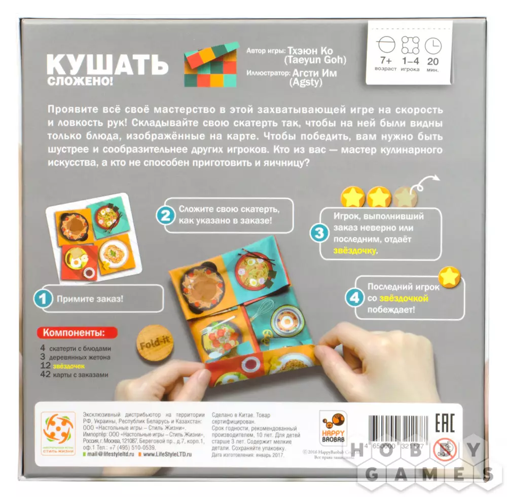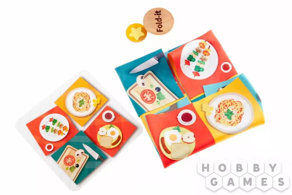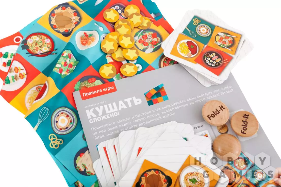 "Кушать сложено" – увлекательная, весёлая и азартная игра на пространственное мышление для 1 – 4 игроков, которую можно взять с собой куда угодно! Помимо прочего, игра развивает и мелкую моторику, и скорость мышления, и память. Игра отлично подойдёт для любой компании, но в развивающих целях в неё можно играть даже с маленькими детьми. Правила очень просты, их можно объяснить так: вам необходимо складывать специальные скатерти таким образом, чтобы получался набор из заданных блюд. Игра обладает двумя наборами карта различной степени сложности. Как эта удивительная игра работает, расскажем далее.