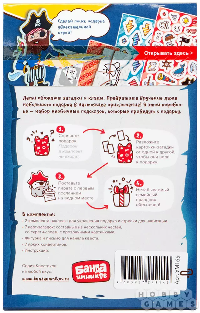 Слоган набора – "Квест дома за 15 минут", и он написан неспроста. В этой коробке вы найдёте всё необходимое для создания и оформления неповторимого квеста для детей. Каждый тематический набор уникален и предоставляет новые наборы загадок и тайн. Осталось только приготовить подарки.