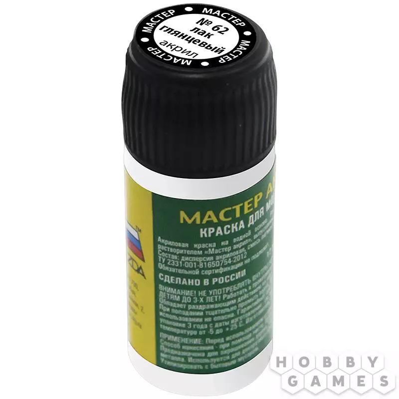 Чтобы придать своей работе завершённый вид, используйте лак "Мастер акрил" от компании Zvezda! Защите своё изделие от внешних воздействий из чего бы оно не было выполнено: металл, пластик или дерево. Данный лак подходит для работы с любыми материалами и придаёт им глянцевость. Не забудьте перемешать перед использованием!
