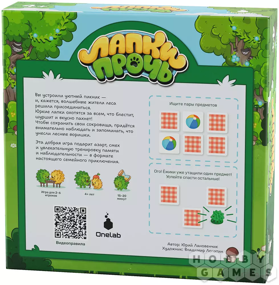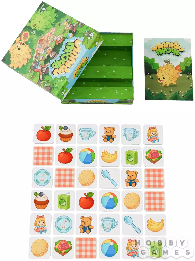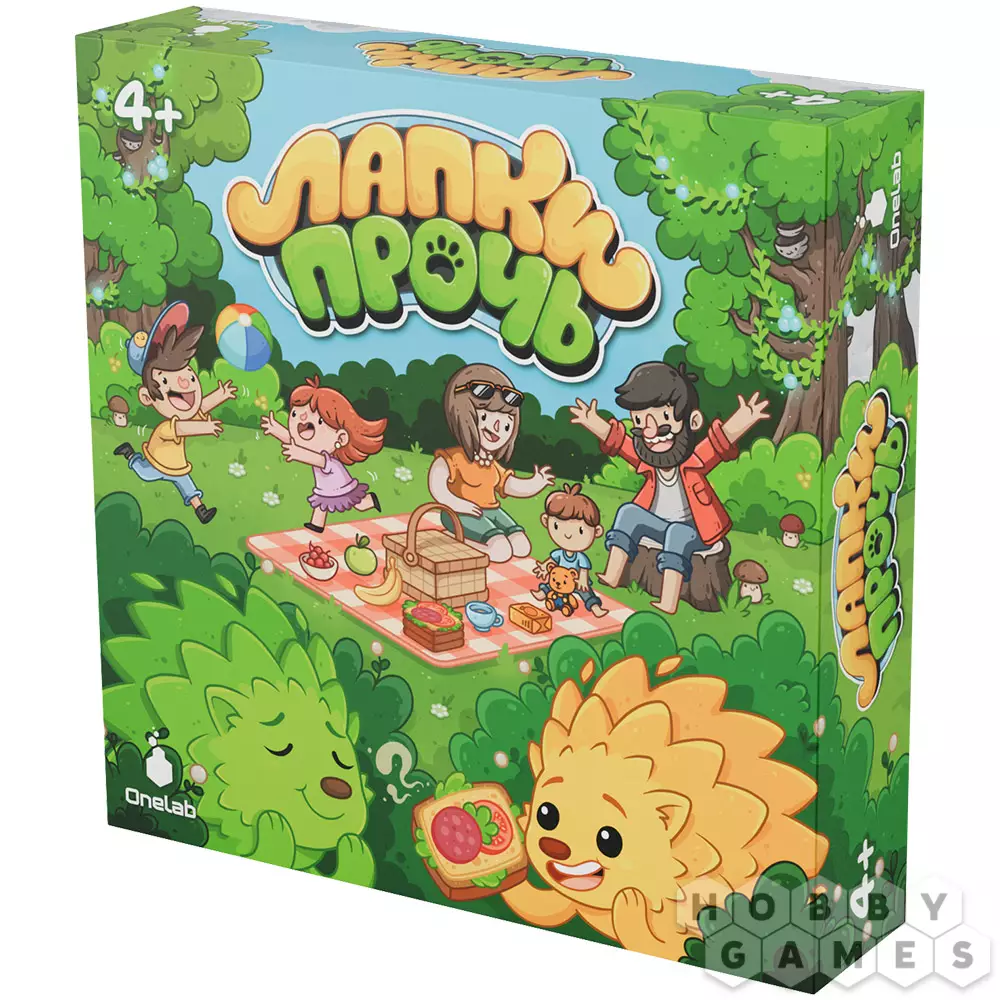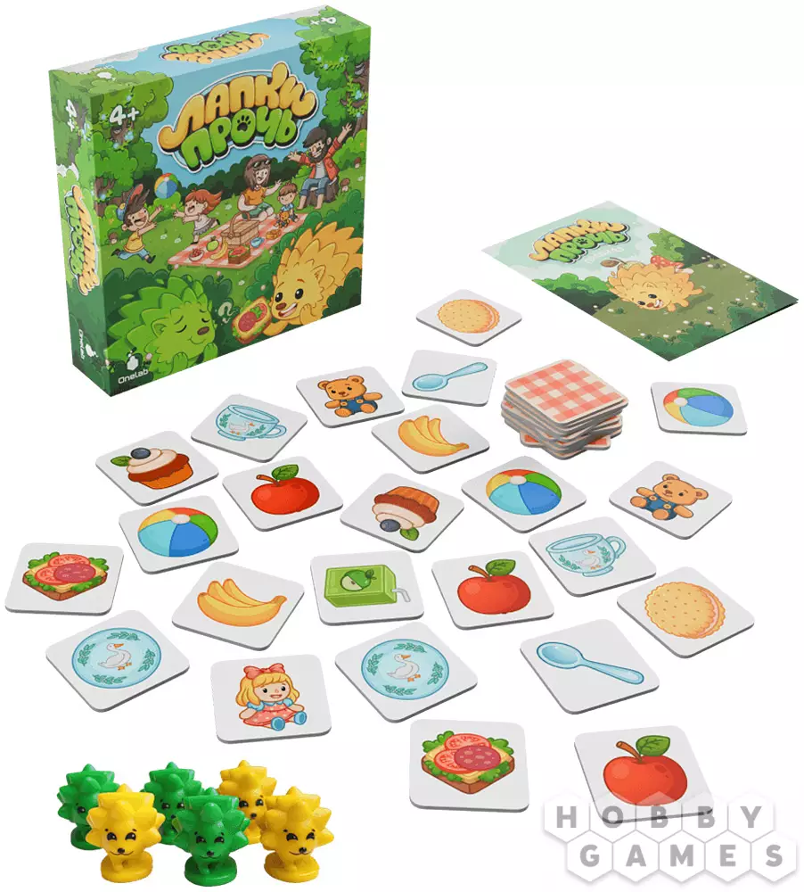 "Лапки прочь" – это развивающий кооператив для детей и их родителей. Здесь все объединены общей целью и вместе пытаются обхитрить шустрых ёжиков. В центре стола квадратом выложены жетоны рубашкой вверх. Вам предстоит по очереди открывать по два из них: если картинки совпали – пара уходит в общую копилку, если нет – жетоны возвращаются на место. Но вот загвоздка – после каждого вашего хода ёжик продвигается вперёд и забирает один из жетонов с поля. Чтобы выиграть, нужно набрать семь пар быстрее, чем их утащат в уютные норки. Удастся ли вам обогнать хитрых воришек?