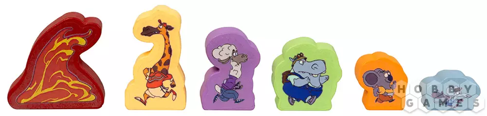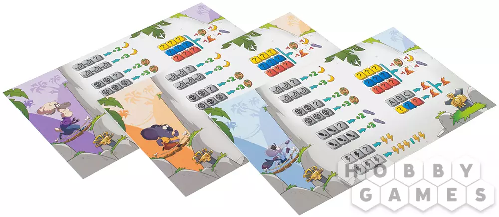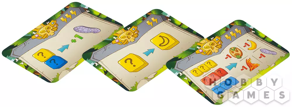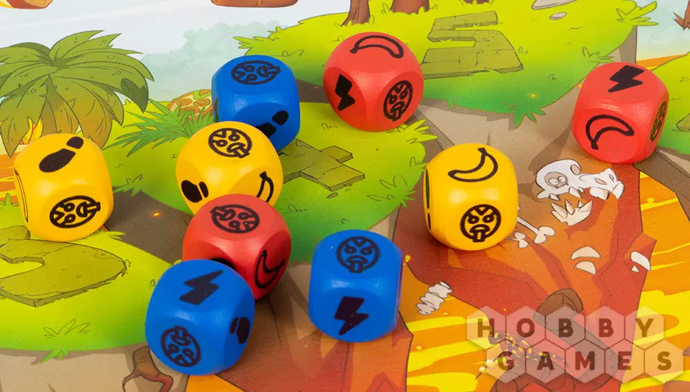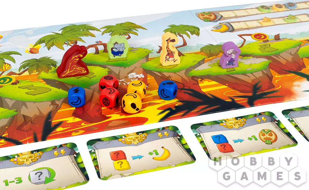 На полученных кубиках наши приключенцы теперь стараются собрать комбинации из двух или трёх одинаковых символов, применяя их по очереди. Одинаковые символы бананов продвигают игроков по счётчику бананов. Если не пройти семь "банановых" клеток, то даже сесть в спасительную лодку не получится. Символы масок дадут вам реликвии, которые и определят победителя, если до лодки смогут добраться несколько перепуганных зверят. Символы перемещения точно так же помогут продвинуть персонажа. А собрав символы молний, можно приобрести карты действий, которые позволяют применять всевозможные эффекты во время бегства от лавы. Так, например, можно поменять символы на кубиках, получить бананы, защититься от уловок и даже спастись от последствий ловушек!