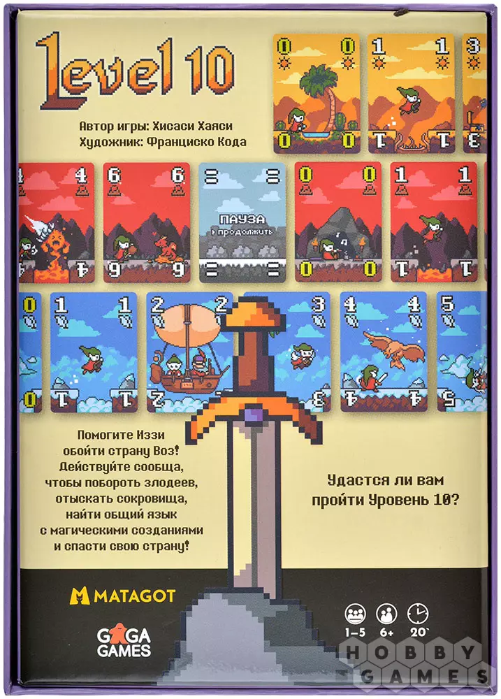 Настольная игра "Уровень 10" – это необычная карточная головоломка в стиле пиксельных ретро-игр, в которую можно играть как в одиночку, так и целой компанией до 5 человек. Вам сообща с другими игроками предстоит помочь главному герою Иззи пройти все 10 уровней в каждом из пяти миров. Для этого вам предстоит выкладывать карты в соответствующие им ряды – они же миры – со значением по возрастанию. Основная задумака заключается в том, что у каждого из игроков свои карты на руках, и вы разыгрываете их по очереди соблюдая особые правила общения! Вы можете сообщать игрокам информацию только о мирах, к которым принадлежат ваши карты на руках, но не их значения.