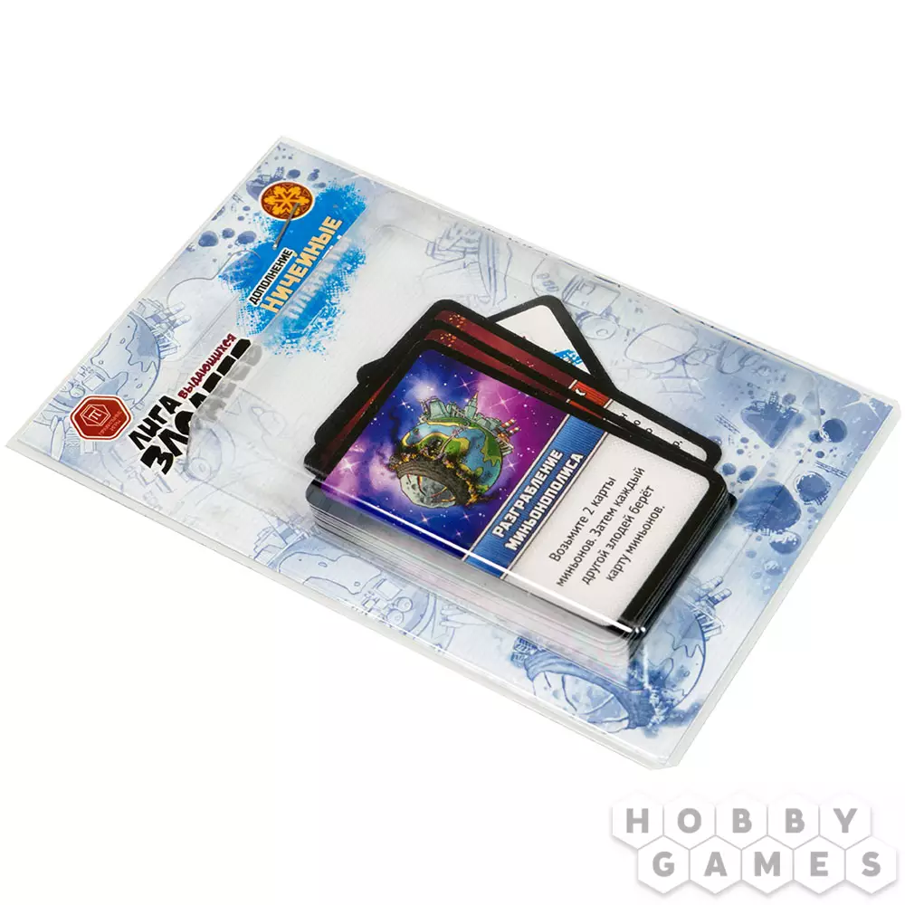 "Лига выдающихся злодеев" – это активная карточная игра, в которой игроки, примеряя на себя роль суперзлодеев, соперничают за власть над миром! Продуманная и глубокая стратегия с морем юмора и великолепными иллюстрациями. Стройте секретные объекты, стреляйте астероидами в базы других злодеев и руководите миллионами верных миньонов. Именно миньоны строят тайные базы и выполняют специальные операции.