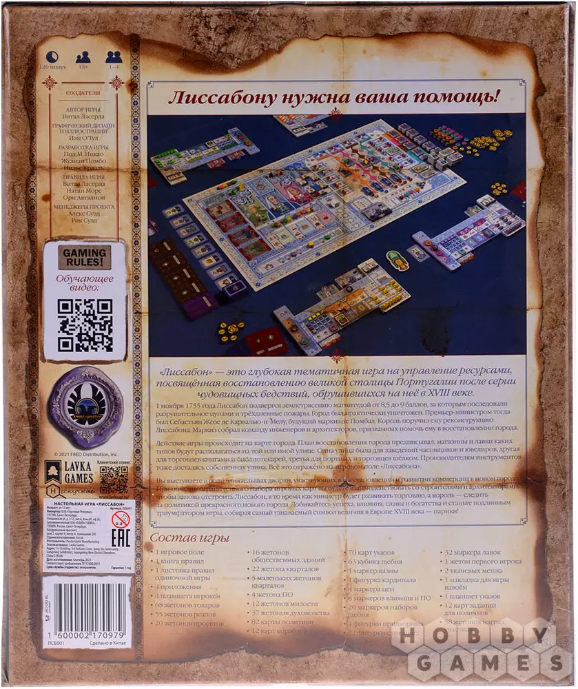 В игре "Лиссабон" вы играете за аристократов, восстанавливающих город после катастрофы. Поле игры представляет собой карту города, на которой вы будете претворять в жизнь планы по развитию коммерции и отстройке города. Комплексные механики игры передают тонкости политической и строительной деятельности в XVIII веке. В игре огромное количество отсылок на реально существовавших личностей, исторические события и явления, а визуальный стиль был выбран с расчётом на соответствие духу эпохи.