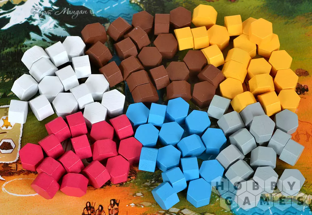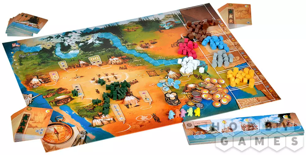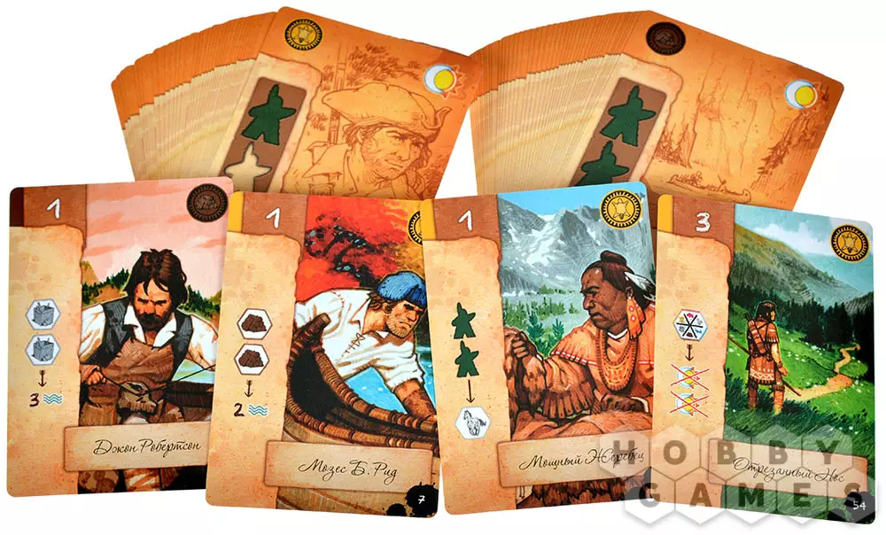 И в первом, и во втором случае потребуется потратить фишки индейцев из личного запаса для оплаты действия. Используя карты персонажей вы сможете добывать базовые ресурсы, такие как древесина, еда, снаряжение и мех, получать новые фишки индейцев, а также осуществлять движение по маршруту. В поселении же вас ждут более интересные действия: