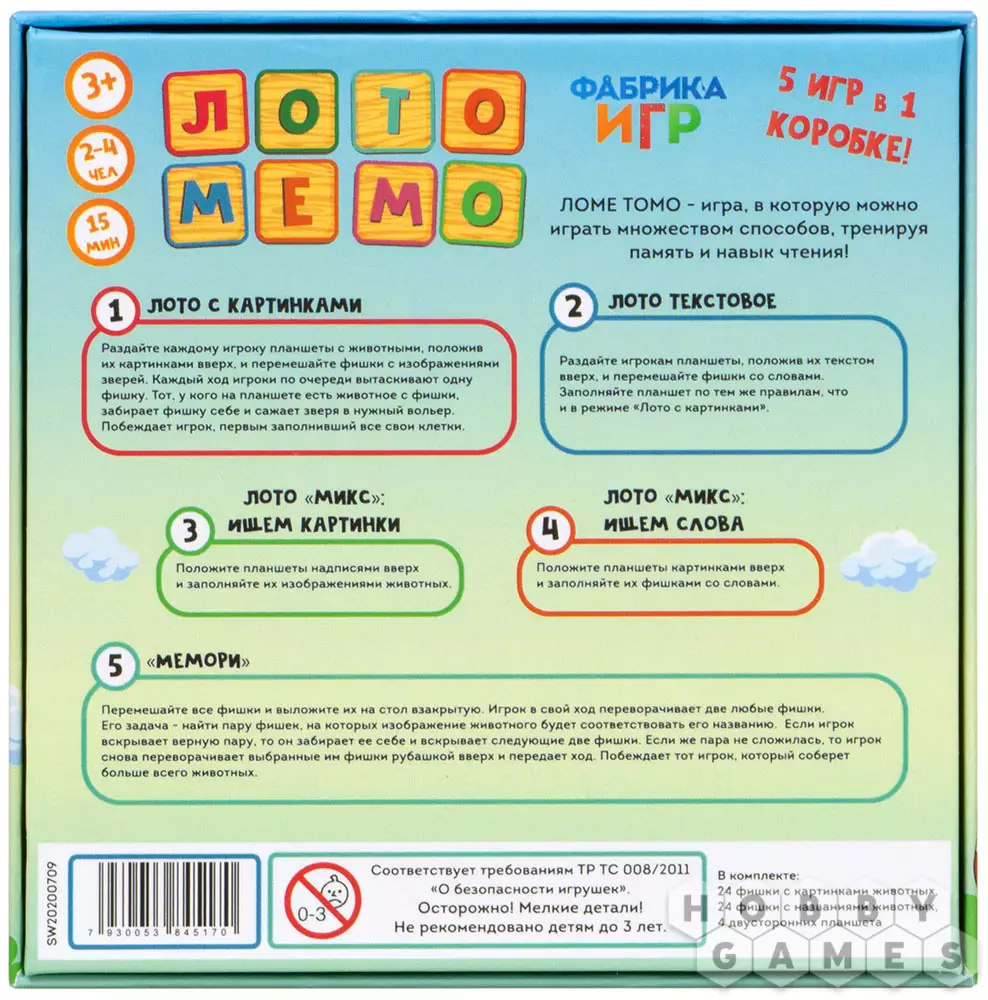 "Ломе Томо" – это всем знакомое лото, в которое можно играть несколькими способами. Вместе с ребёнком вы сможете отправиться в мир животных, тренируя память, образное мышление и навыки чтения. В коробочке вы найдёте фишки с картинками и словами, обозначающими жителей зоопарка. В это лото можно играть пятью способами!