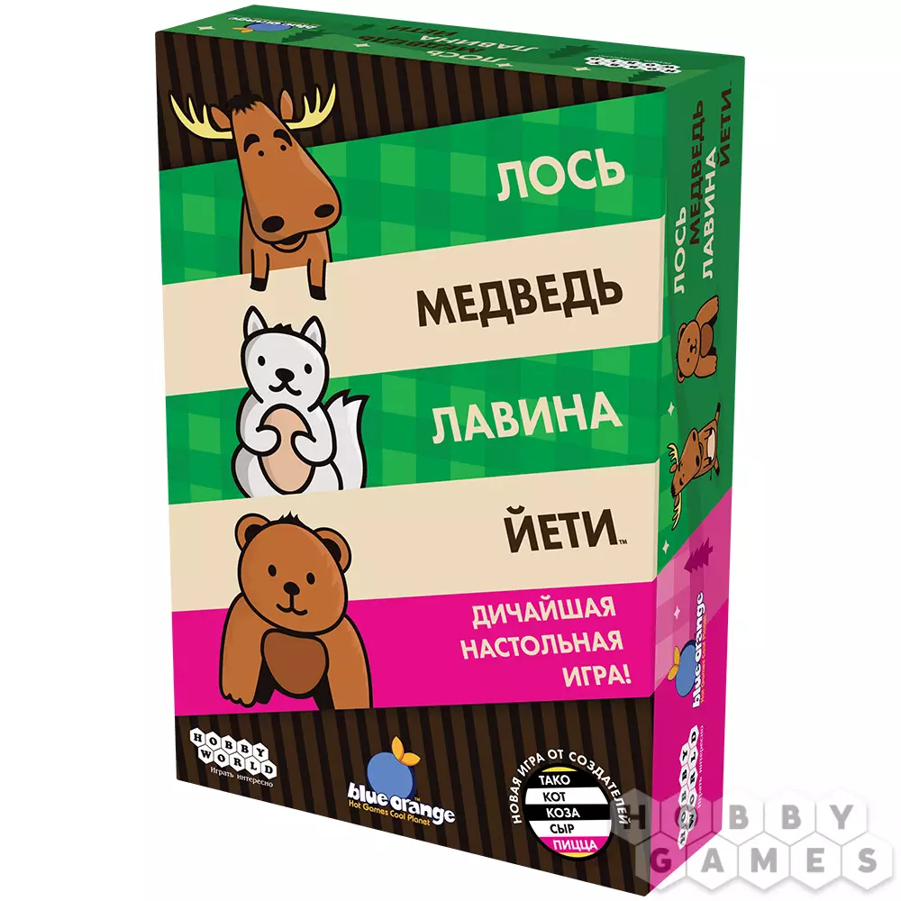 "Лось, медведь, лавина, йети" – это азартная карточная игра от создателя знаменитой серии "Тако, кот, коза, сыр, пицца". В ней вам предстоит участвовать в безумном соревновании на скорость реакции и внимательность. Все игроки одновременно скандируют ритмичную считалочку, а на ключевом слове выкладывают по одной карте в центр стола – и тут же бросаются забирать подходящие. Задача простая: собирать карты с одинаковыми животными. Но два персонажа – коварный йети и неумолимая лавина – способны вмиг обнулить ваши достижения, если вы случайно или нарочно прихватите их, так что будьте осторожны!