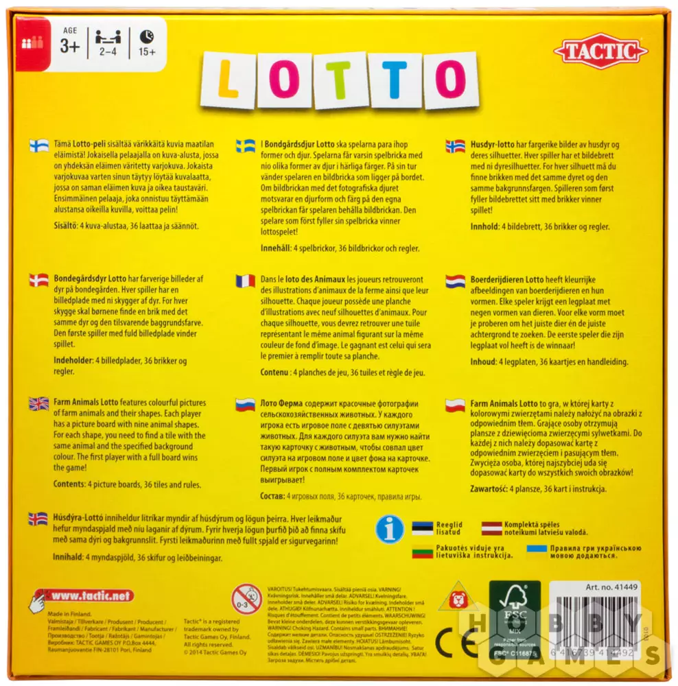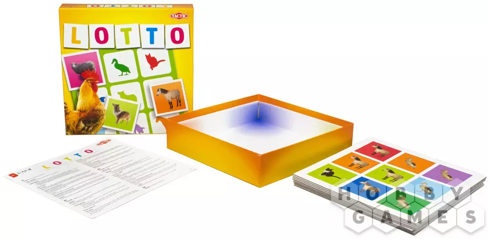 Игра в лото ещё никогда не была такой весёлой и увлекательной! Ваши дети будут в восторге от этой красочной версии классической игры, а игровой процесс навсегда займёт место в их сердце, как когда-то это произошло у их родителей и прародителей. Всего в игре вас ожидает 12 игровых полей и 108 карточек с цветными зверюшками.