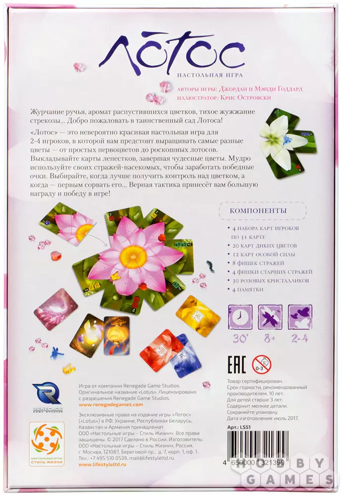 "Лотос" – это невероятно красивая настольная игра для 2-4 игроков, в которой вам предстоит выращивать самые разные цветы – от простых первоцветов до роскошных лотосов. Выкладывайте карты лепестков, завершая чудесные цветы. Мудро используйте своих стражей-насекомых, чтобы заработать победные очки. Выбирайте, когда лучше получить контроль над цветком, а когда – первым сорвать его… Верная тактика принесёт вам большую награду и победу в игре!