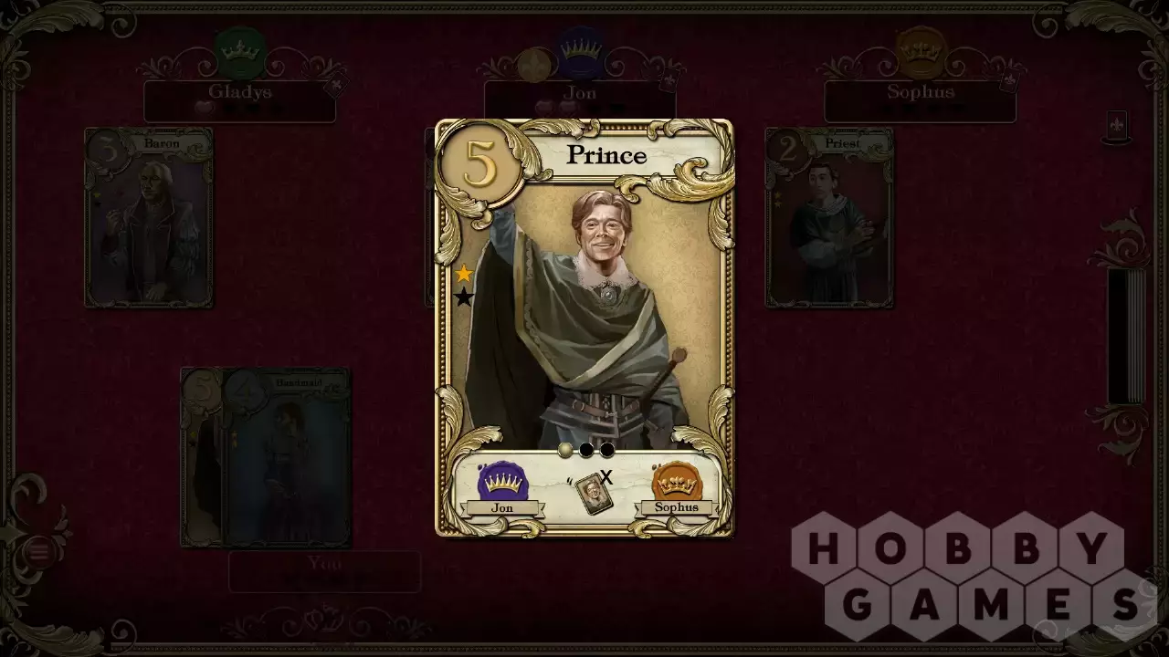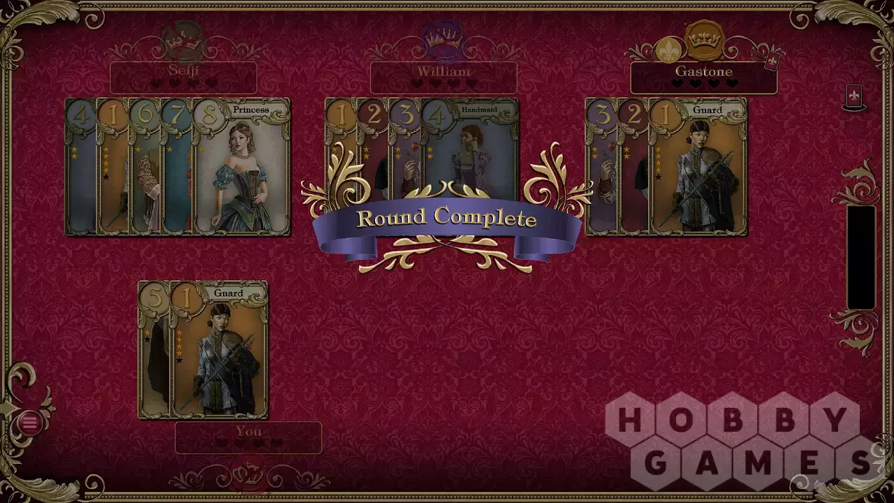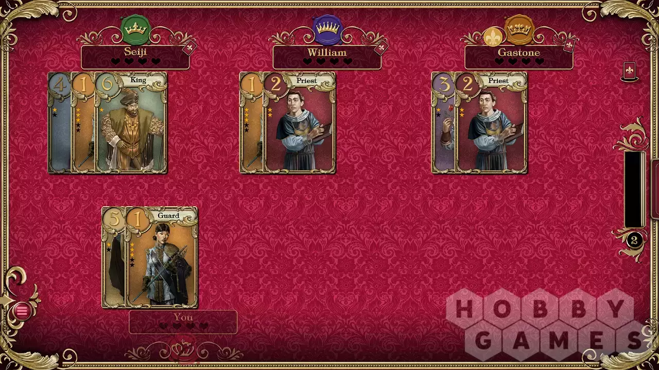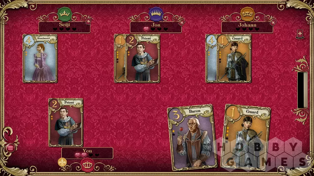 You only ever have two cards in your hand. Draw and play your cards to get closer to the princess. Everyone staying in the castle could aid you in their own way: guards and princes can help discredit letters from other suitors, priests will give you precious information about your rivals while the handmaiden will protect your letter at any cost!