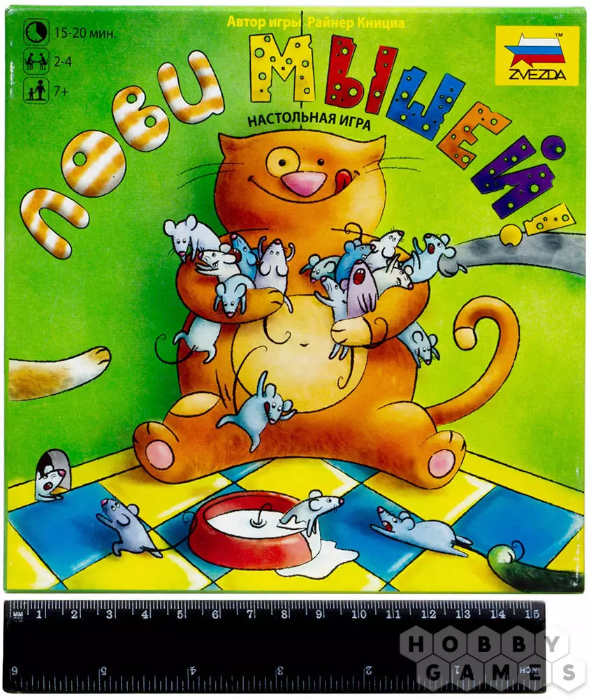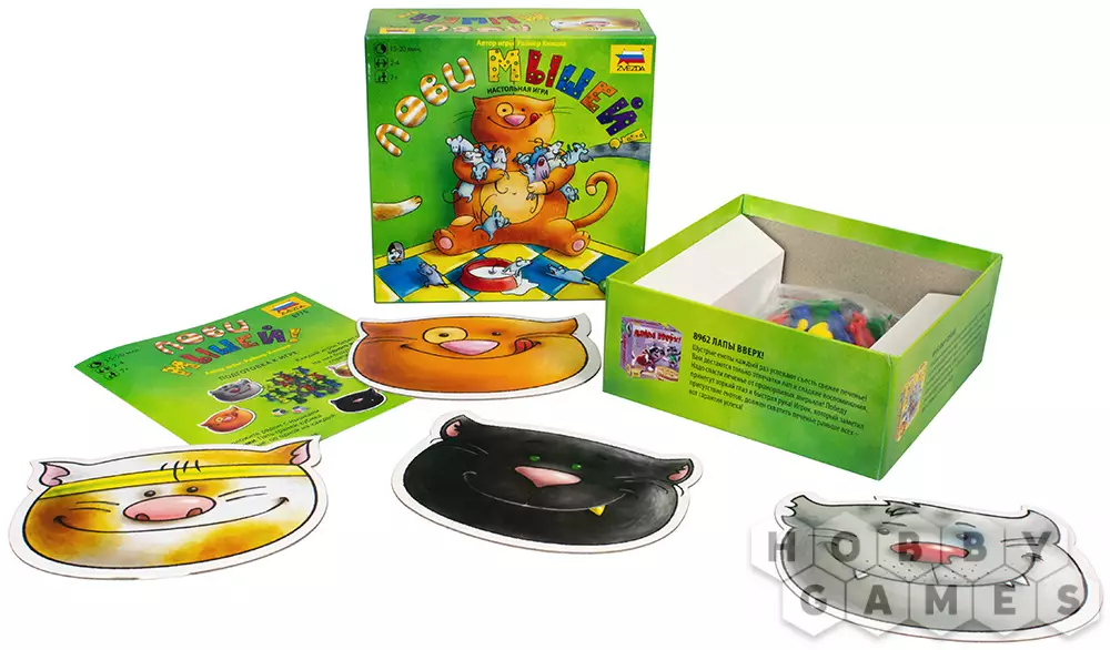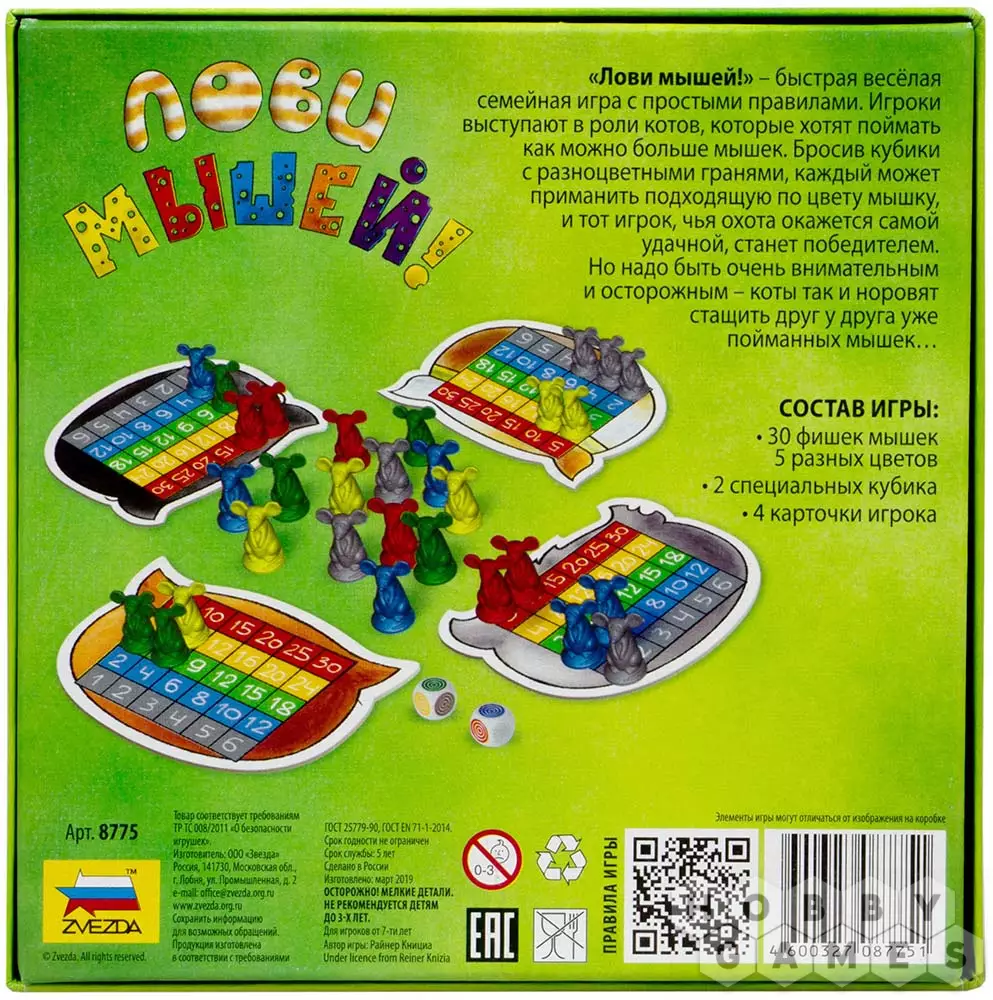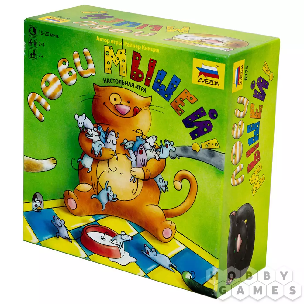 В настольной игре "Лови мышей" голодные кошки пытаются поймать разноцветных мышек. В свой ход игроки бросают кубики, а затем «ловит» мышь цвета, выпавшего на кубике, а если у вас выпал дубль одинаковых цветов, вы можете даже стащить мышку или две у другого игрока. Вы можете продолжать бросать кубики до тех пор, пока ловите разных мышей. Стоит цвету повторится, все ваши мыши разбегутся, а ход уйдёт другому игроку.
