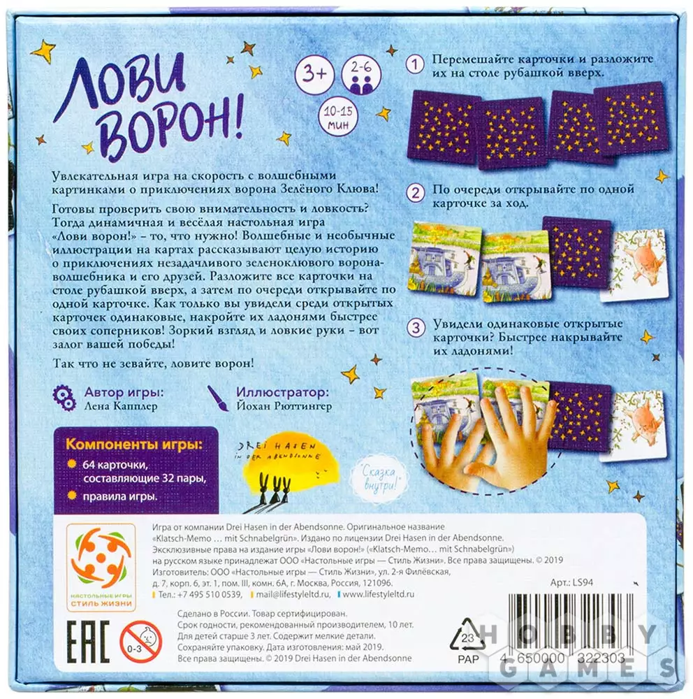 "Лови Ворон" – это настольная игра для всей семьи с механикой "Мемори". Эта игра интересная и, что немаловажно, удивительно полезная! Вечер в большой или маленькой компании с такой игрой пролетит незаметно! Наверняка вы станете поклонником игр "Мемори", сыграв всего лишь раз.