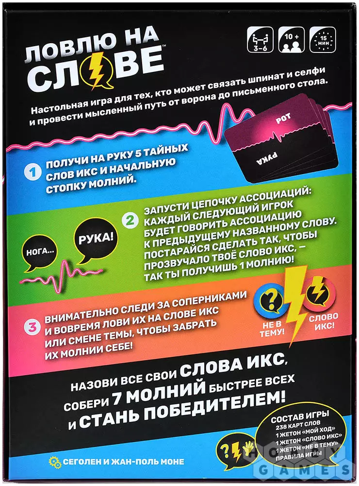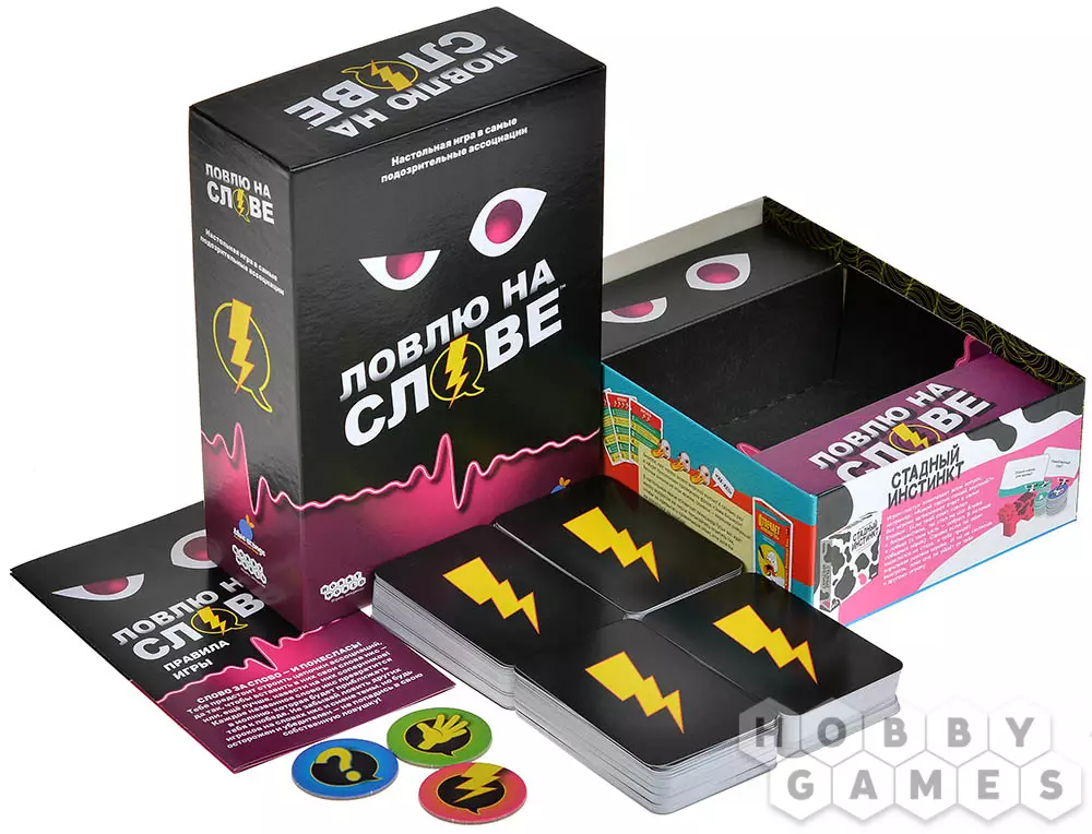 "Ловлю на слове" – это настольная игра, в которой вам нужно будет выстраивать цепочки ассоциаций, при этом внедряя в них свои "икс-слова" так, чтобы никто не заподозрил подвоха. Сможете, и получите молнию, а это крайне полезно, ведь итоговая цель – собрать 7 молний! Внимательно наблюдайте за соперниками и не стесняйтесь подлавливать их на слишком очевидной смене темы и попытке внедрить своё слово икс – так вы сможете украсть их молнии и ещё быстрее приблизиться к победе!