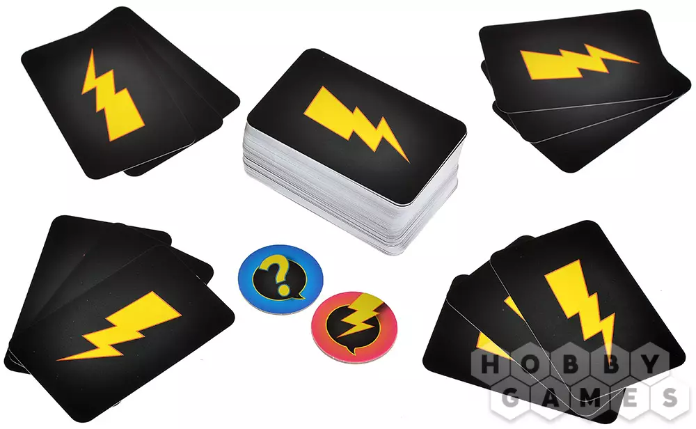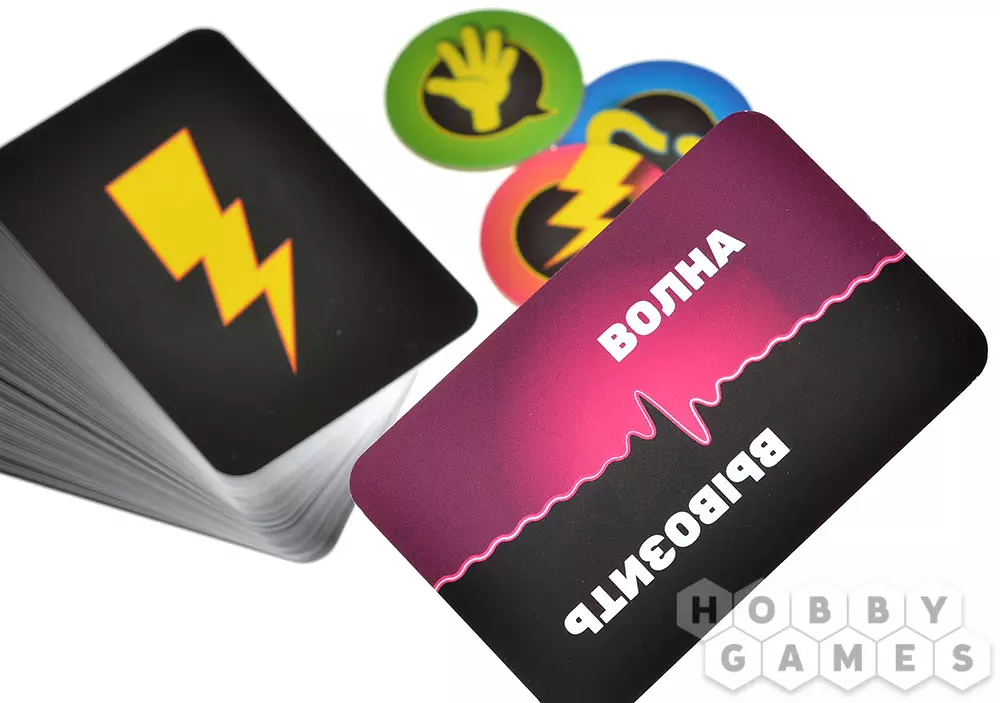 Каждая карта разделена на две половины: розовую и чёрную, а на обороте изображена молния. Для начала определитесь, какой цвет вы будете использовать. Затем раздайте игрокам по 5 карт и набор из 3 молний. Слова, написанные на выбранном цвете, и будут вашими словами-икс. Затем раскройте верхнюю карту колоды – это начало вашем ассоциативной цепочки.