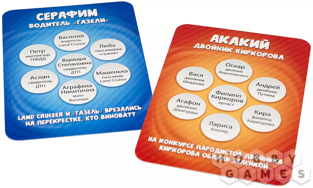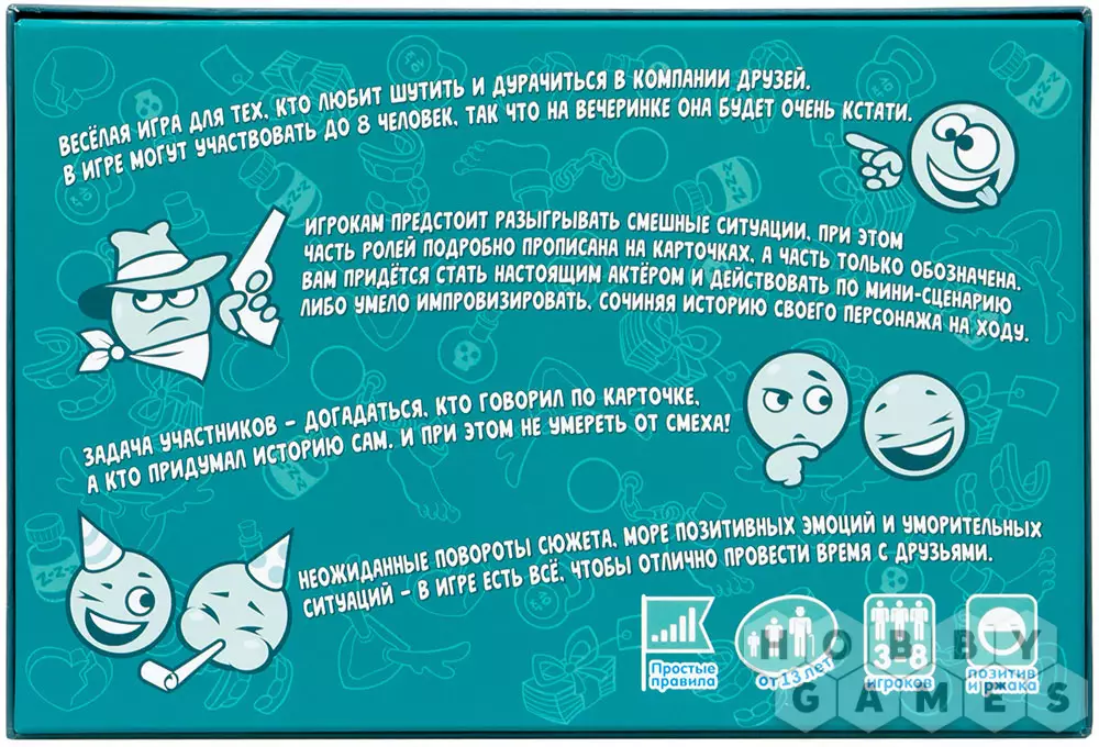 Задача участников – догадаться, кто говорил по карточке, а кто импровизировал, и при этом не умереть от смеха! Неожиданные повороты сюжета, море позитивных эмоций и уморительных ситуаций – в игре есть всё, чтобы весело провести время с друзьями.