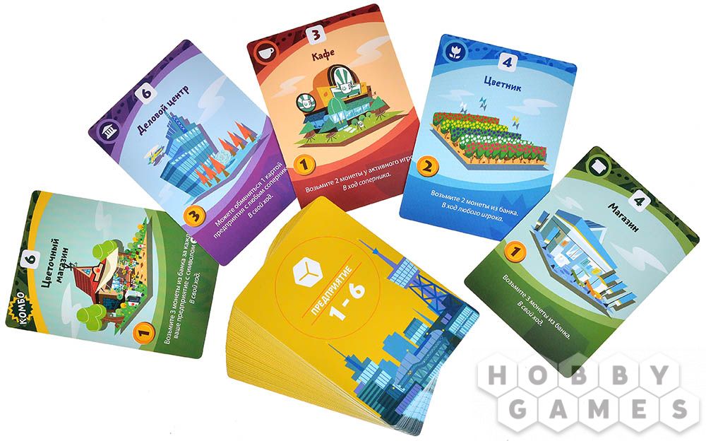 Когда прибыль получена, активный игрок приступает к строительству. Для этого нужно выбрать одну карту из резерва, оплатить её стоимость и разместить в своём городе. Далее ход передаётся следующему игроку. И вот так, шаг за шагом, каждый из вас идёт к своей мечте – идеальному городу!