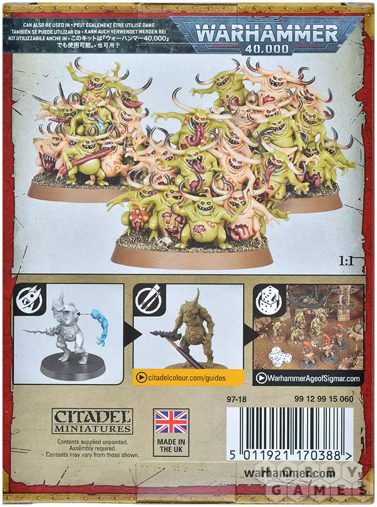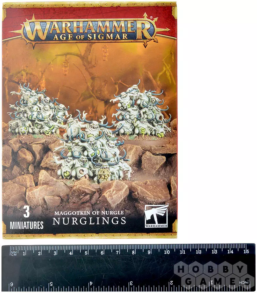 Всего в наборе содержится 16 пластиковых деталей для сборки 3 различных орав Нурглингов. Также в комплекте вы найдёте три 40-миллиметровых подставки.