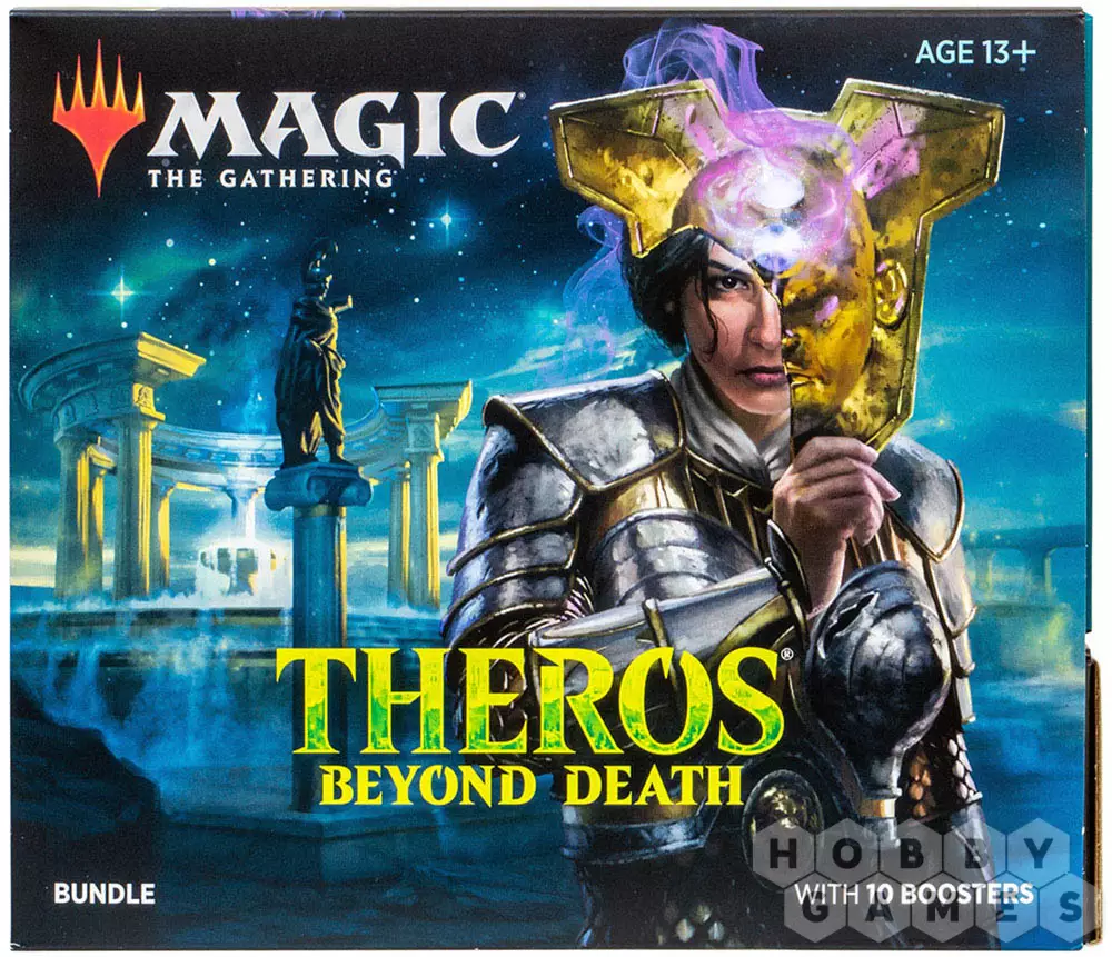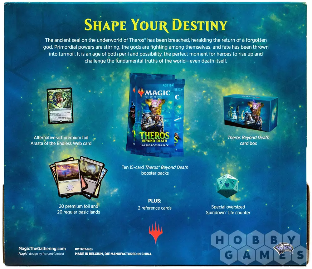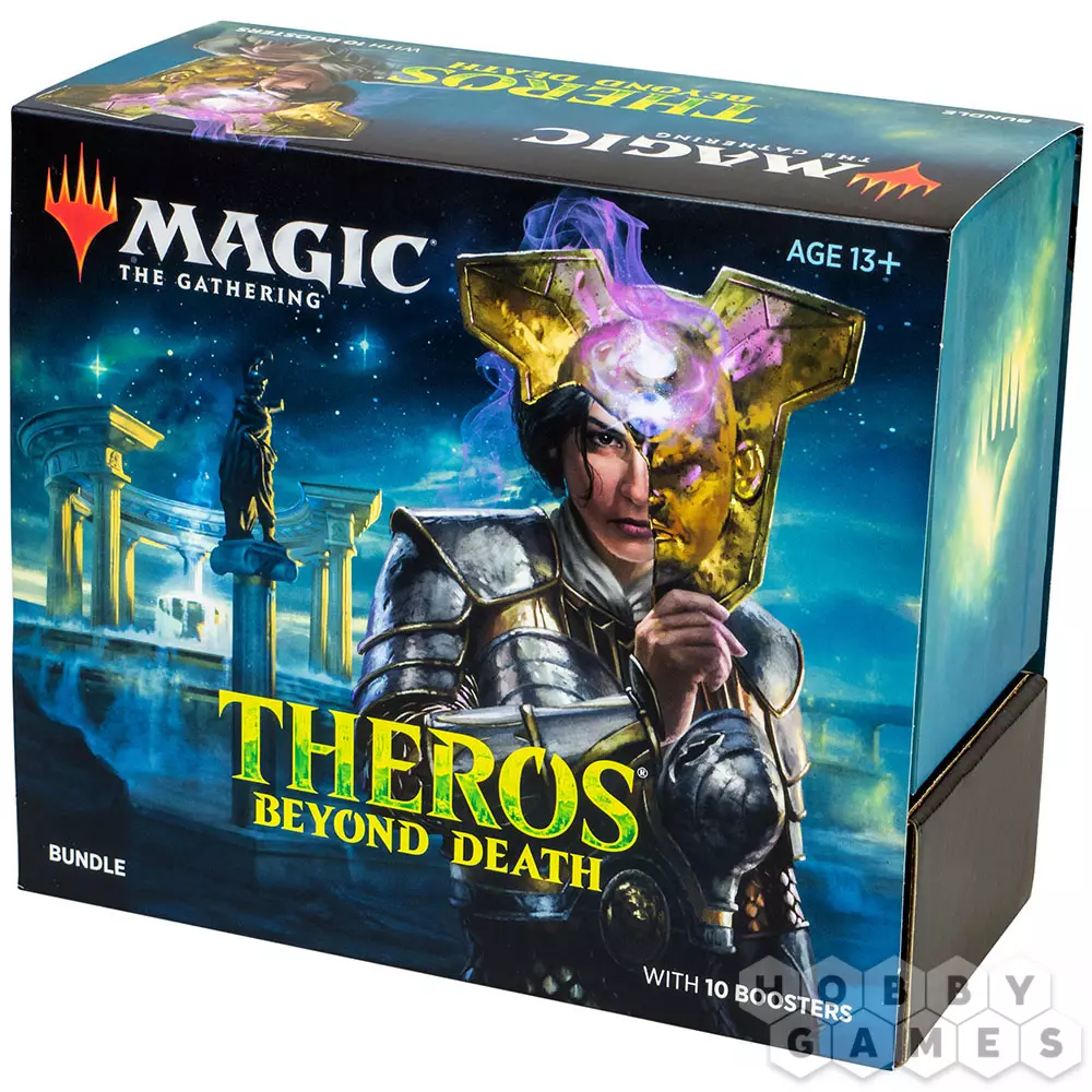 Этот стартовый набор Magic: The Gathering выпуска Theros Beyond Death включает в себя бустеры на английском языке. В наборе есть специальный кубик D20 большого размера – Spindown, который используется для подсчёта жизней, стилизованная коробка для карт, а также комплект стартовых земель, включая фольгированные. Каждый бандл включает в себя богатый набор материалов о новых механиках и картах сета.