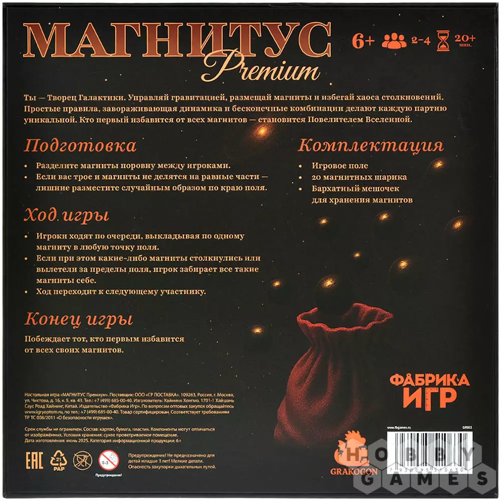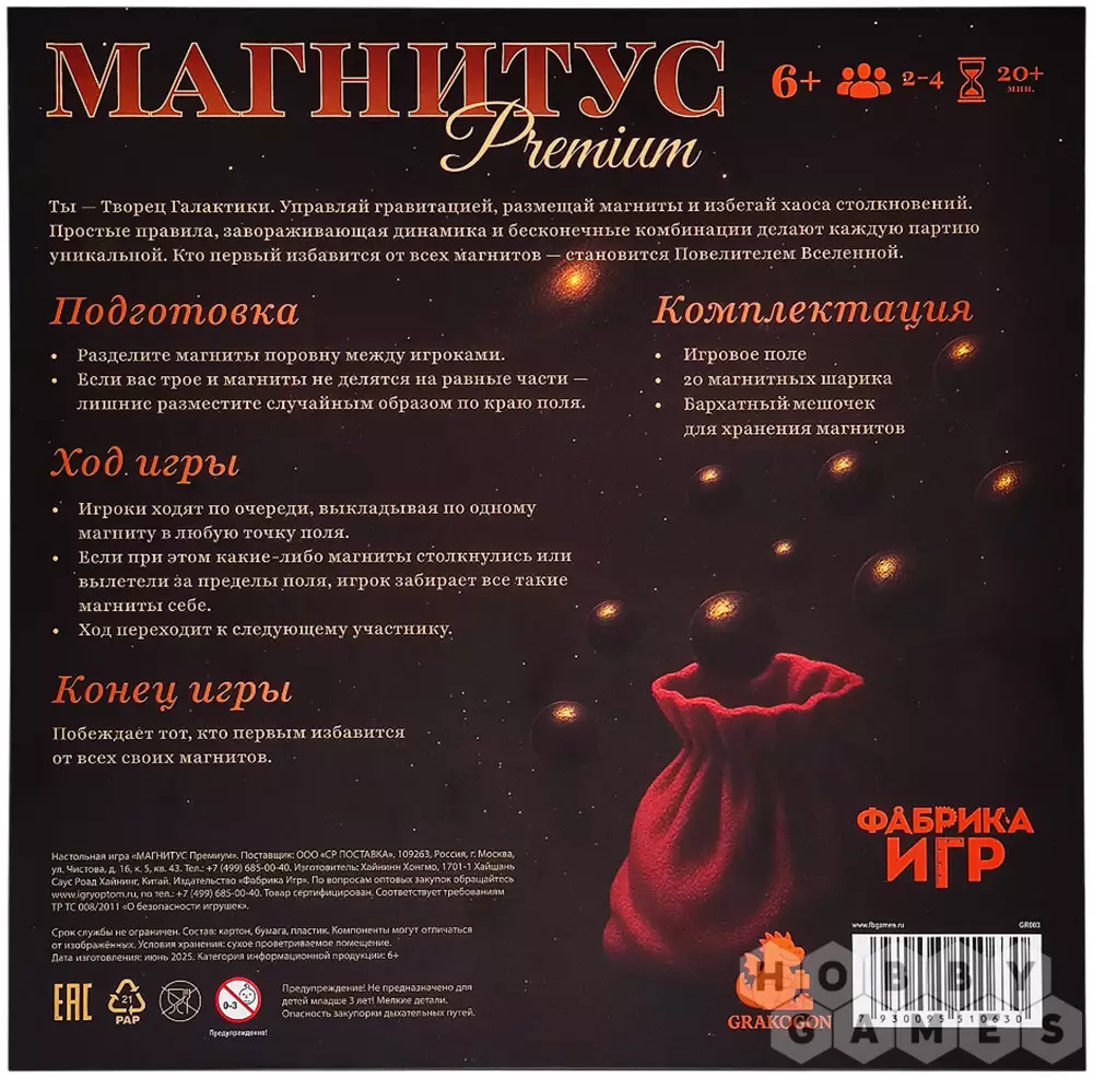 "Магнитус "– это игра, где магнитные шарики – ваша армия и обуза одновременно. Мудро разместите их, создавая хрупкое равновесие, и они останутся на поле. Один неверный шаг, и цепная реакция сметёт все ваши старания! Победит тот, кто сумеет обуздать эту невидимую силу и первым избавится от своих шаров.