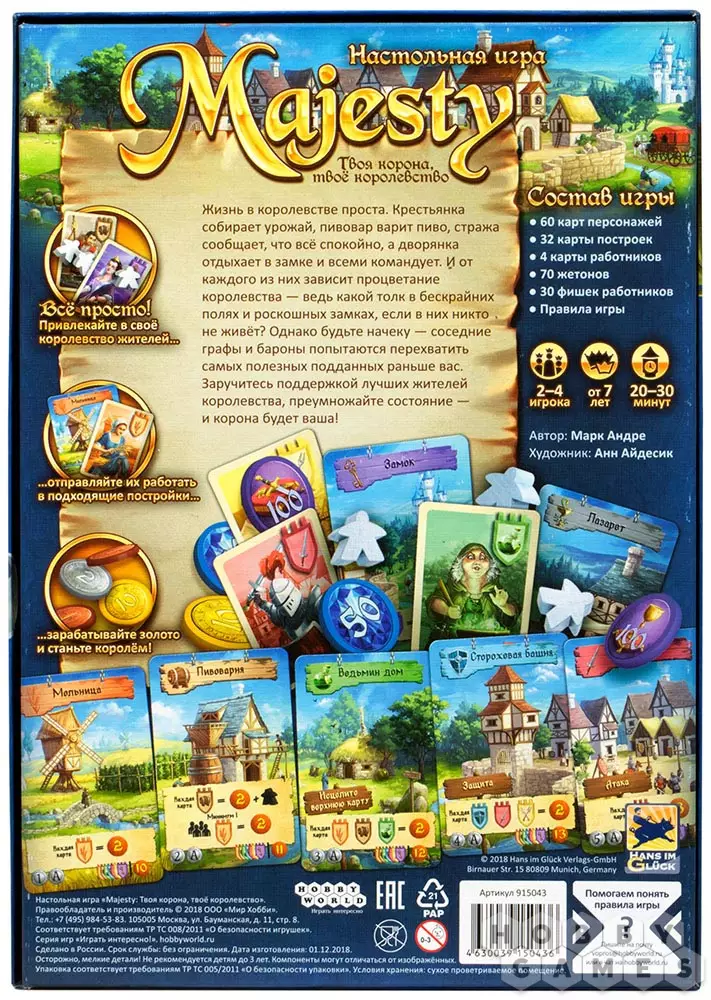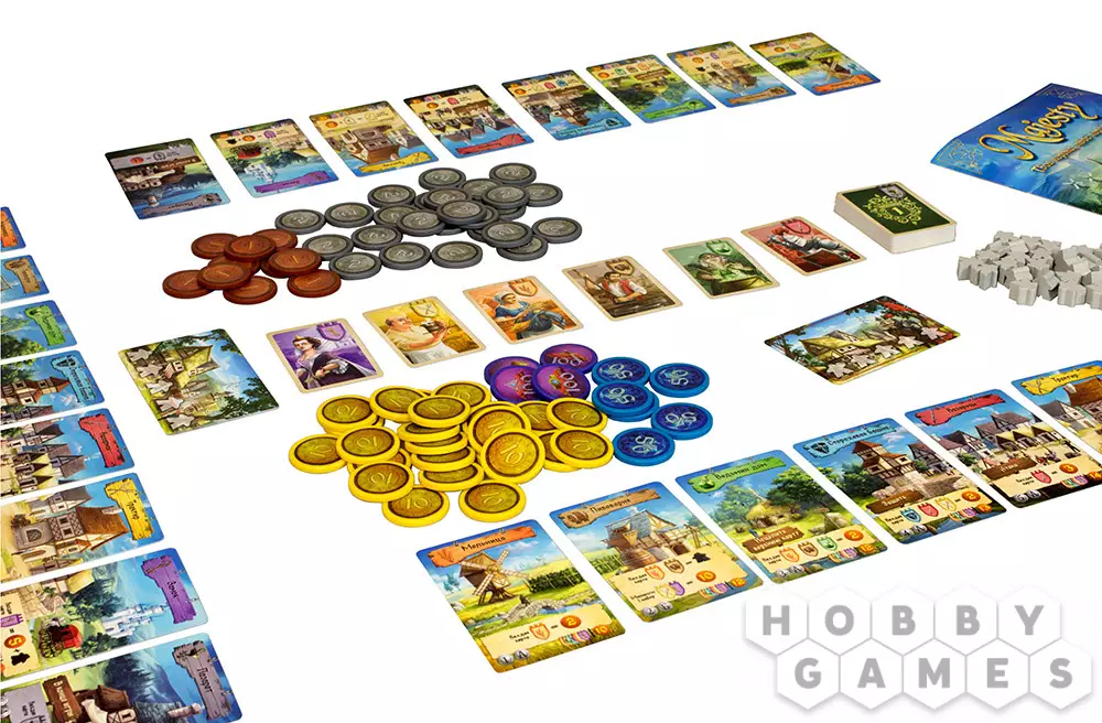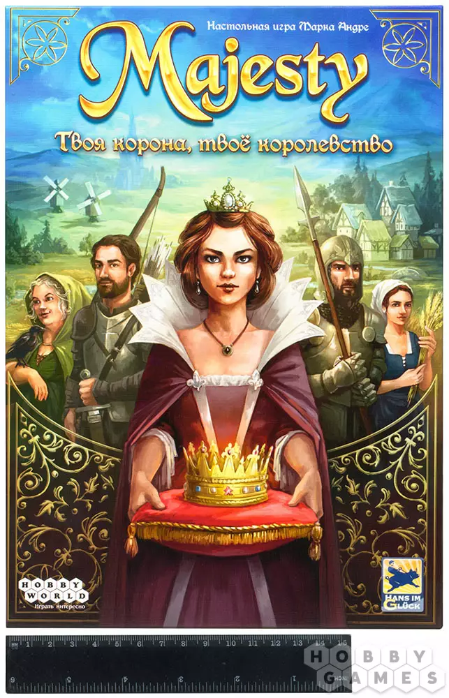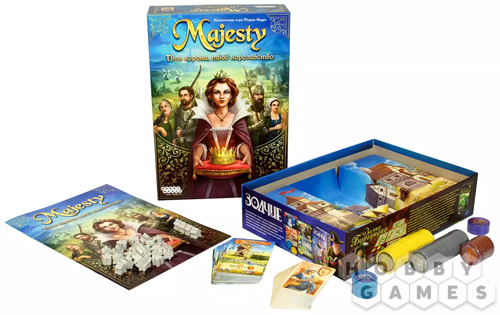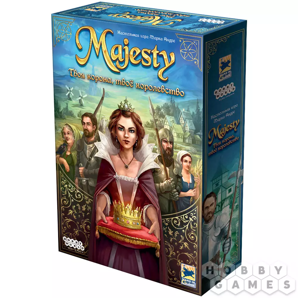 "Majesty: Твоя корона, твоё королевство" – увлекательная экономическая игра в средневековом сеттинге для 2-4 игроков, предлагающая быстрый и увлекательный игровой процесс, простые в освоении правила и очень приятный и сочный дизайн карт и других компонентов.
