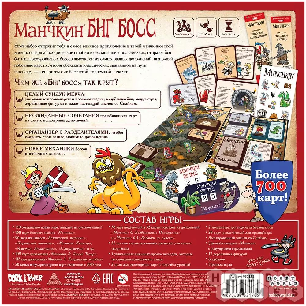 "Манчкин: Биг Босс" – это грандиозный набор, который отправит вас в самое масштабное приключение в вашей манчкиновской жизни. Он объединяет лучшие карты из самых популярных дополнений, создавая неожиданные и взрывные комбинации, которые вы ещё не испытывали. Теперь ваш путь к победе станет ещё более непредсказуемым!