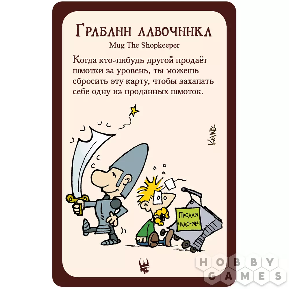 Когда кто-нибудь другой продаёт шмотки за уровень, ты можешь сбросить эту карту, чтобы захапать себе одну из проданных шмоток.
