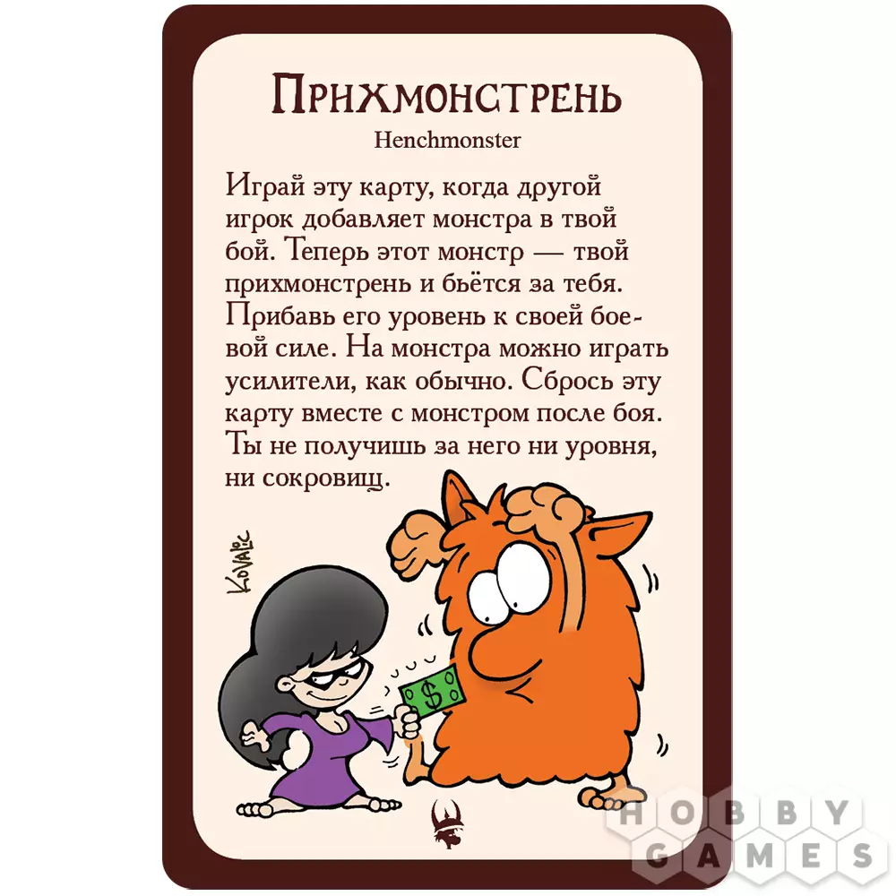 Играй эту карту, когда другой игрок добавляет монстра в твой бой. Теперь этот монстр – твой прихмонстрень и бьётся за тебя. Прибавь его уровень к своей боевой силе. На монстра можно играть усилители, как обычно. Сбрось эту карту вместе с монстром после боя. Ты не получишь за него ни уровня, ни сокровищ.