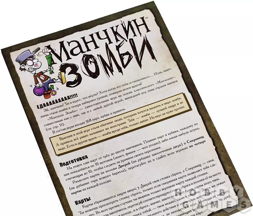 А зомби зомби зомби! Эй, манчкин! Ты в курсе, что уже мёртв? Хотя, разве это когда-нибудь останавливало манчкинов… Итак, на этот раз Вы стали зомби, со всем вытекающими… Вперёд, медленно и расторопно с протянутыми руками отправимся в "Манчкин Зомби"!