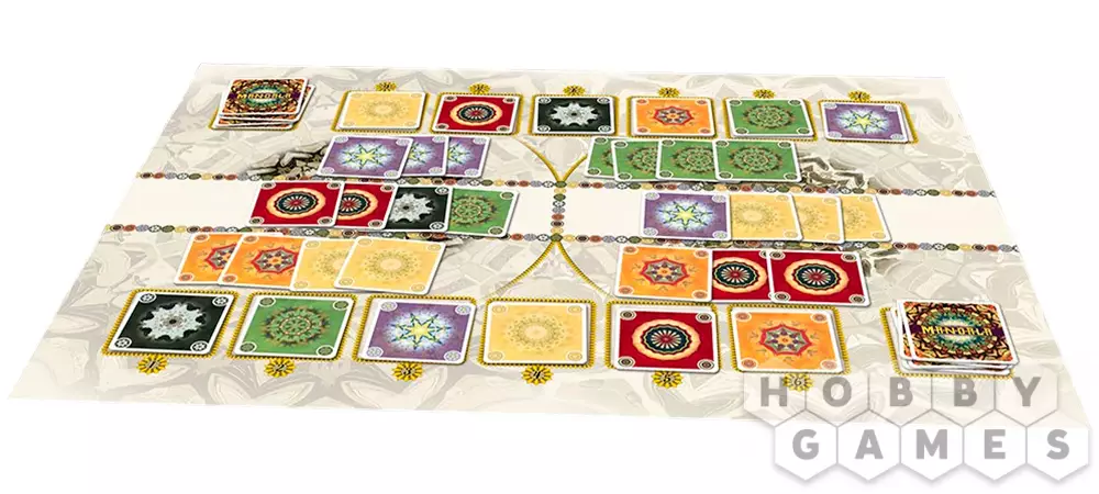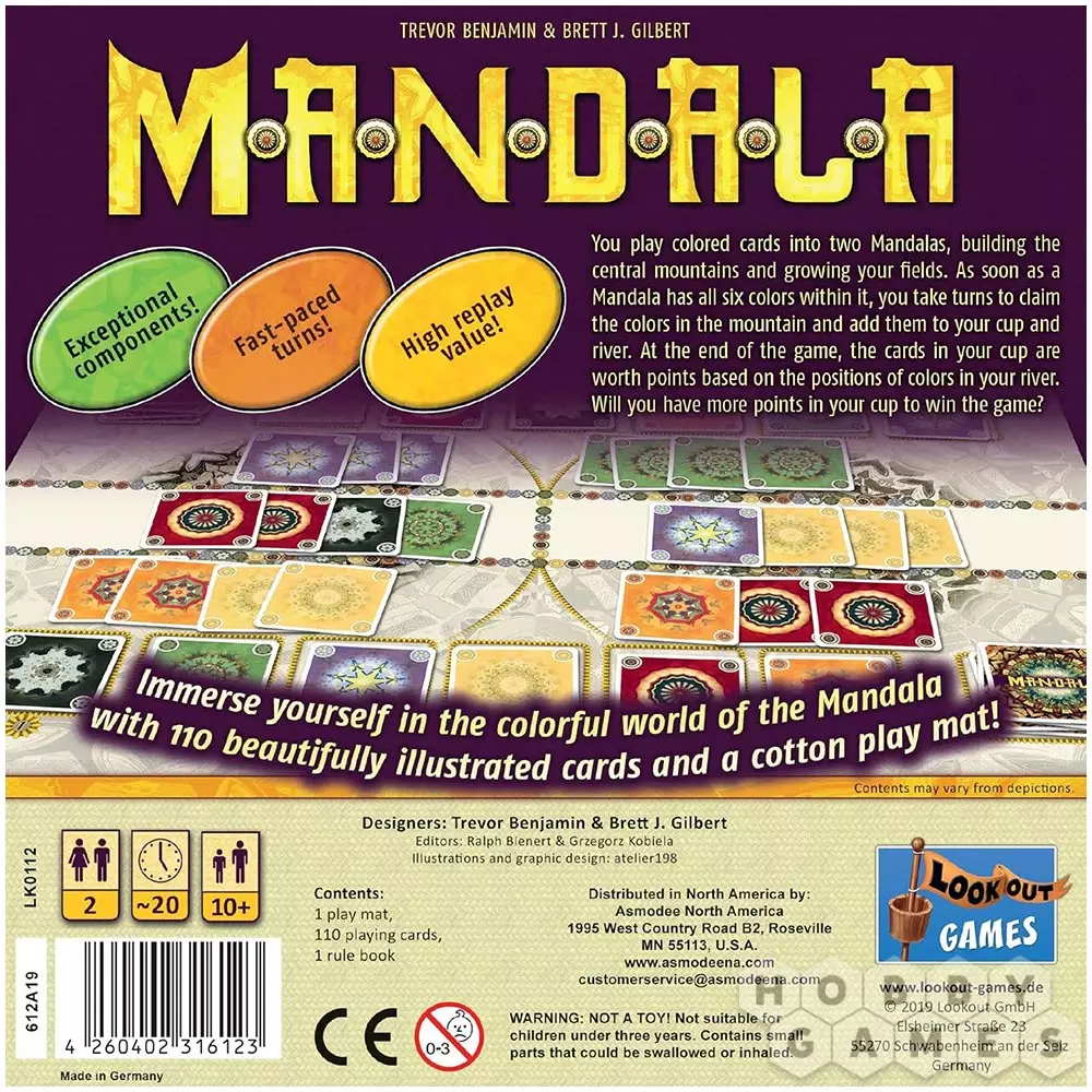В карточной игре Mandala вам и вашему противнику поочередно разыгрываете карты цветного песка в две мандалы, строя центральные горы и размещая карты на своих полях. Вы получаете на руки шесть карт. На игровом коврике расположены две мандалы, "река" и "чашка" каждого игрока. Мандалы разделены на три зоны: гору и две личные зоны игроков. В свой ход вы можете выбрать одно из трёх действий: