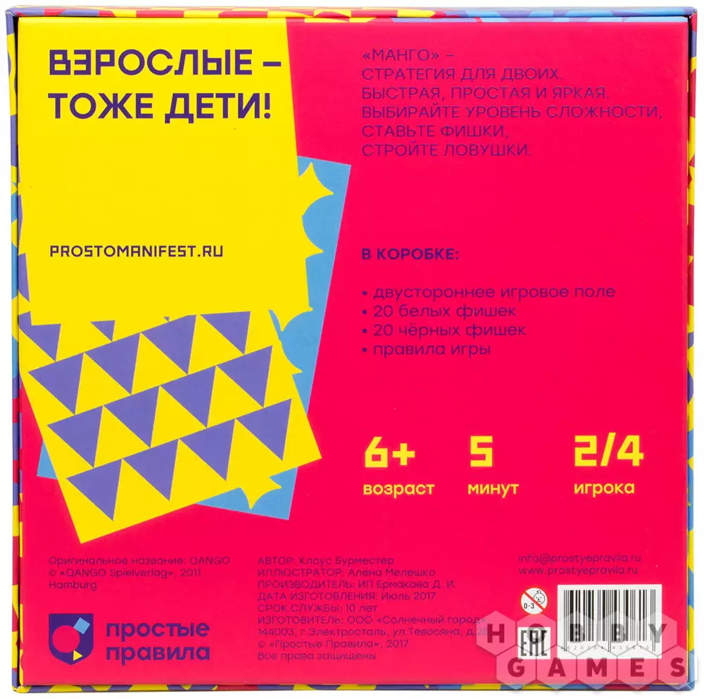 "Манго" – это настольная игра для тех, кто любит играть быстро и просто. Для тех, кто любит поупражняться в тактике и стратегии, но не готов сидеть два часа над игрой. Именно за это "Манго" любят и взрослые, и дети.