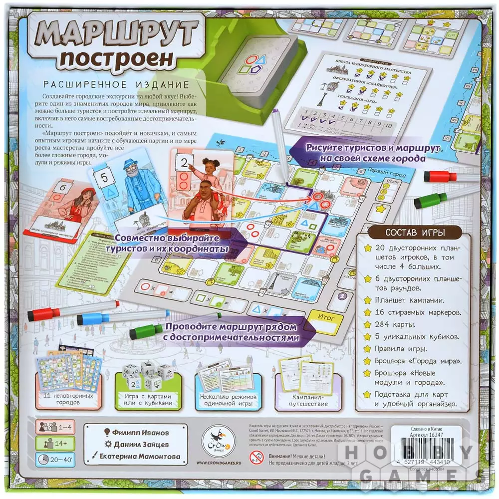 "Маршрут построен. Расширенное издание" – это настольная игра, которая превратит вас в создателя идеальных экскурсий по уникальным городам мира. В каждом из них вас ждут особые правила и достопримечательности, а также три уровня сложности и разные системы составления маршрутов, которые можно комбинировать по своему вкусу. Ваша задача – привлекать туристов с карт раунда, продумывать оптимальные пути между точками их интереса и мастерски балансировать между пожеланиями гостей и возможностями города. Дополнительные модули и секретные компоненты делают каждую партию непохожей на предыдущую, а интерактивный геймплей позволяет выстраивать собственную стратегию, конкурируя с другими игроками или просто наслаждаясь процессом создания идеального путешествия. Настолка прекрасно подходит для тихих, лёгких вечеров с семьёй или друзьями – самое то после тяжёлой рабочей недели. Так вперёд – творить незабываемые впечатления?