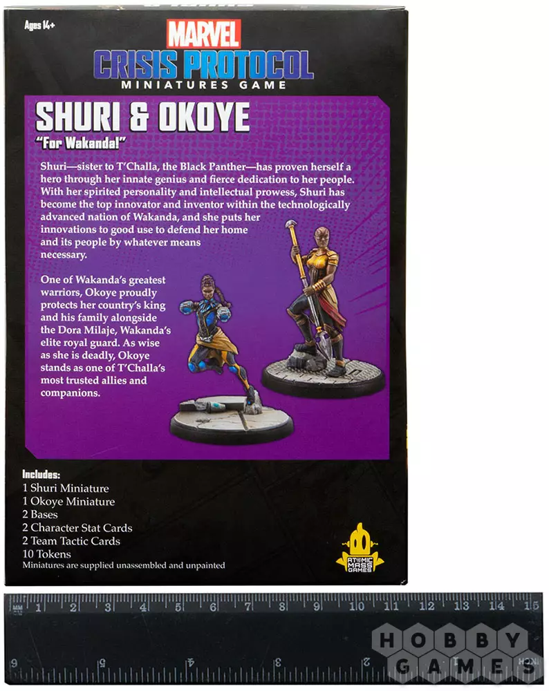 В команде с Шури выступает Окойе, возглавляющая королевскую гвардию Ваканды – элитное спецподразделение Дора Миладж. Мудрая и спокойная Окойе великолепна на поле боя, сроажая одного противника за другим с помощью своего смертоносного копья. Окойе – одна из самых надёжных соратниц Т'Чаллы, как и Шури, и они отлично дополнят сработанную команду супергероев для Marvel Crisis Protocol.