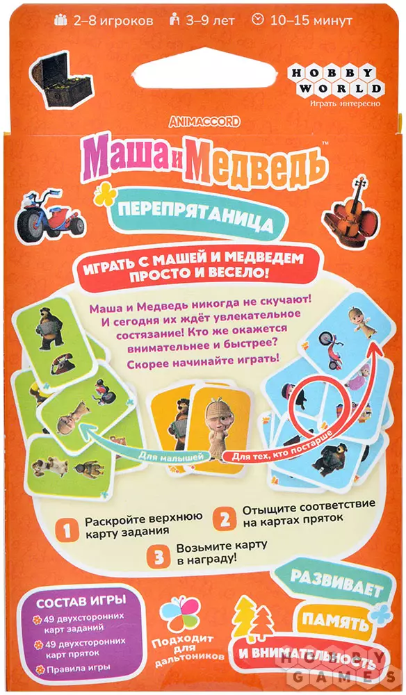 Так, и как тут ходят, чтобы победить? Игру начинает самый младший из игроков. Он переворачивает верхнюю карточку из колоды заданий, и все одновременно начинают искать на картах пряток того персонажа или предмет, который изображён на открытой карточке. А чтобы было интереснее и веселее, предметы и персонажи изображены по-разному. Например, предметы могут быть повёрнуты в разные стороны, а персонажи – в разных позах, образах или с разными предметами в руках (или лапах).