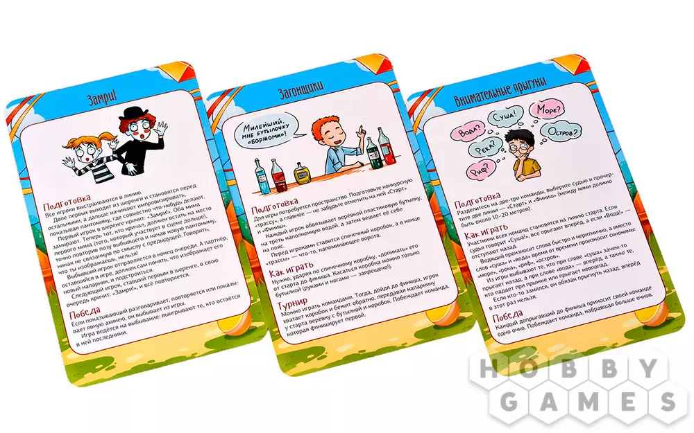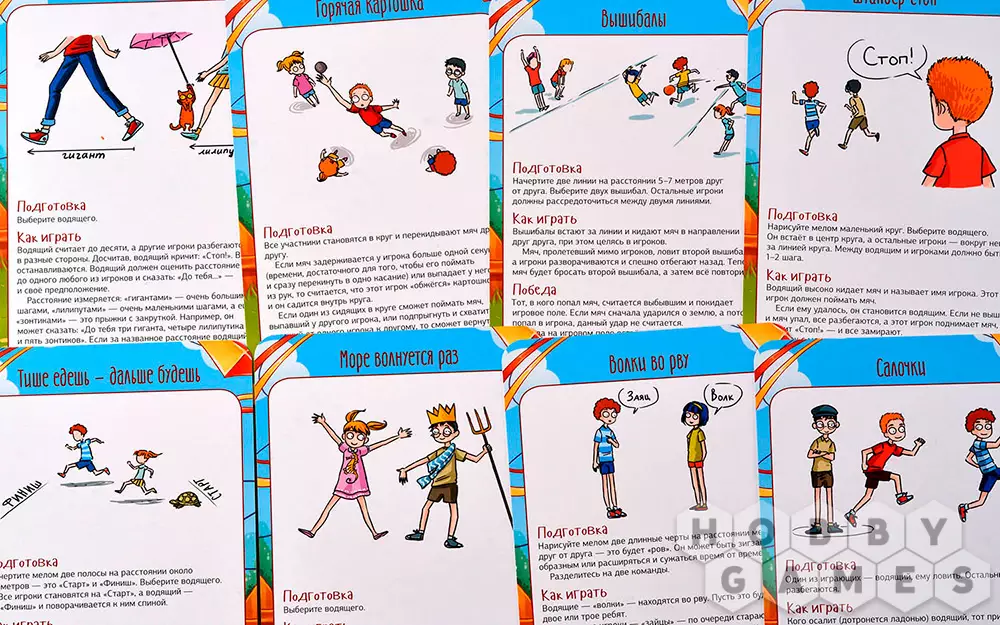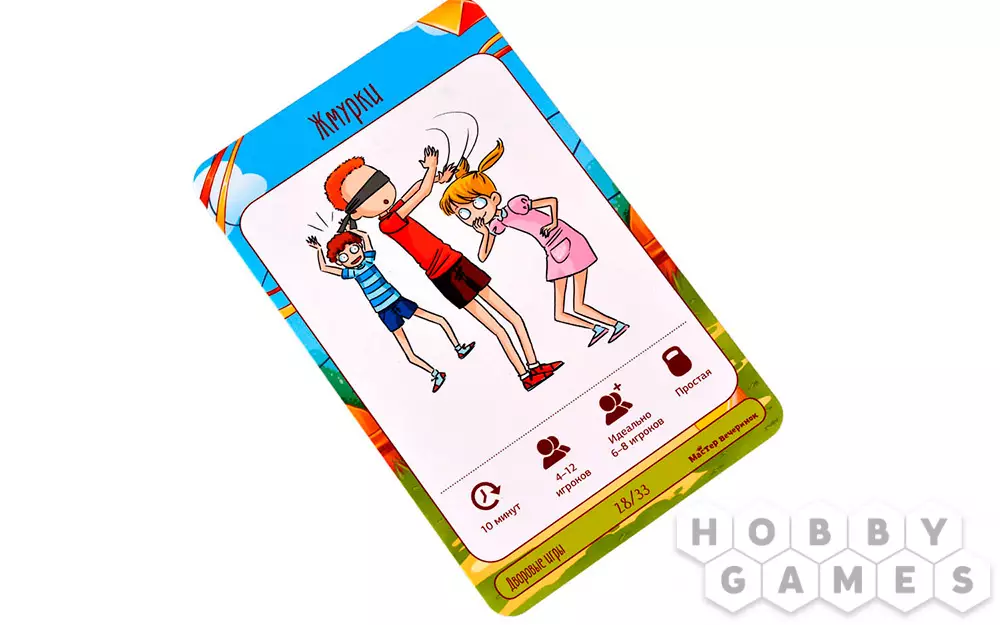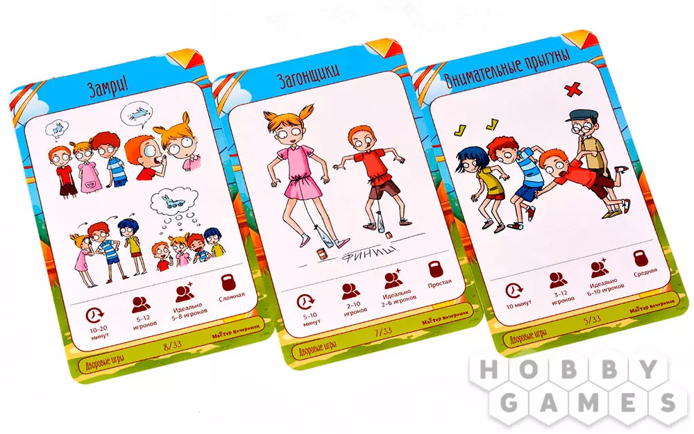 В коробке с настольной игрой "Мастер вечеринок: Дворовые игры" вы найдёте 33 карты с подробным описанием подвижных игр – что потребуется для начала игры, как именно играть и каковы условия победы. "Горячая картошка", "Вышибалы", "Море волнуется раз", "Загонщики", "Внимательные прыгуны" и многие-многие другие развлечения собраны здесь! Возьмите игру с собой на пикник или на дачу и увлекательно проведите время с детьми, ведь, как известно, в каждом взрослом живёт ребёнок, а это значит, вас ждёт море веселья!