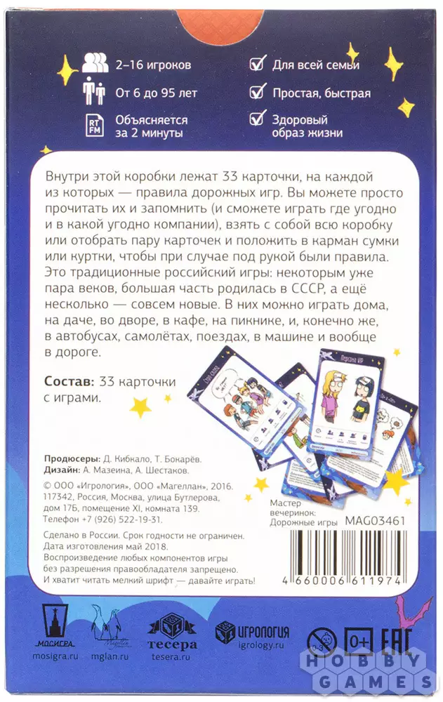 Станьте мастером любой вечеринки вместе с набором дорожных игр! Одна маленькая коробочка, а внутри аж тридцать три игры для любых дорожных приключений. Среди них вы точно найдёте себе игру по душе! Каждая карточка является и правилами, и описанием, и названием игры. Традиционные игры, большинство из которых родились в СССР и любимы многими поколениями. Конечно же во все эти игры можно играть и дома, а также в поездах, в кафе, на природе и так далее, одной дорогой они не ограничивают вас.