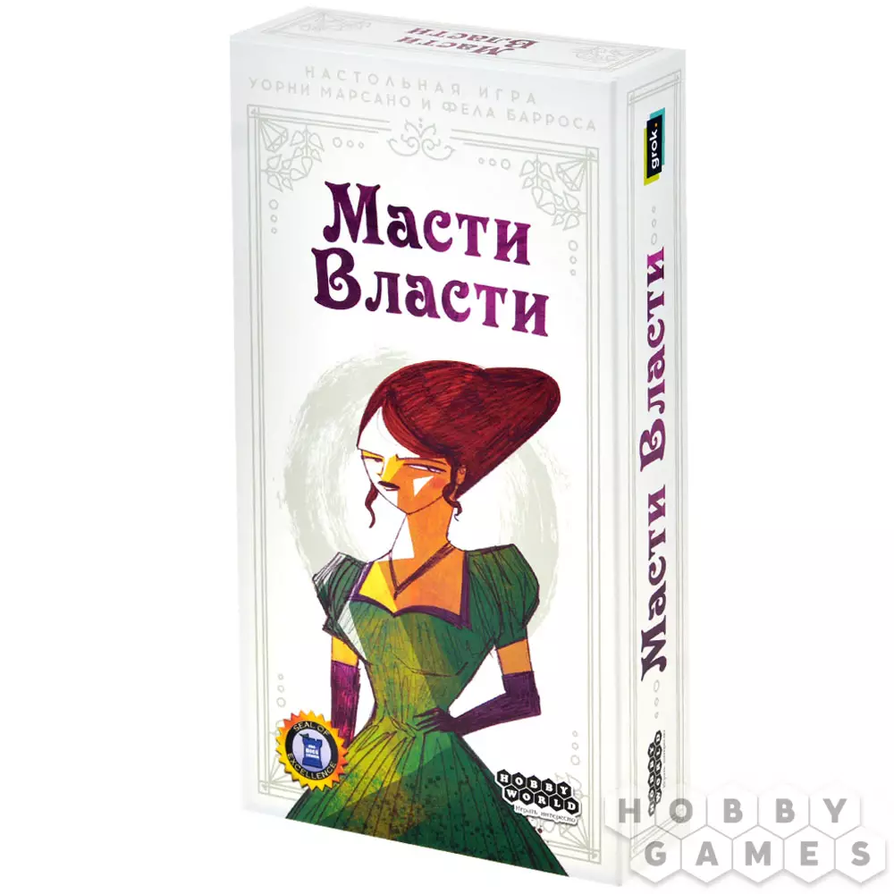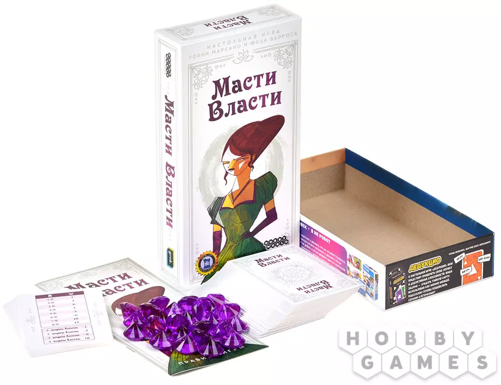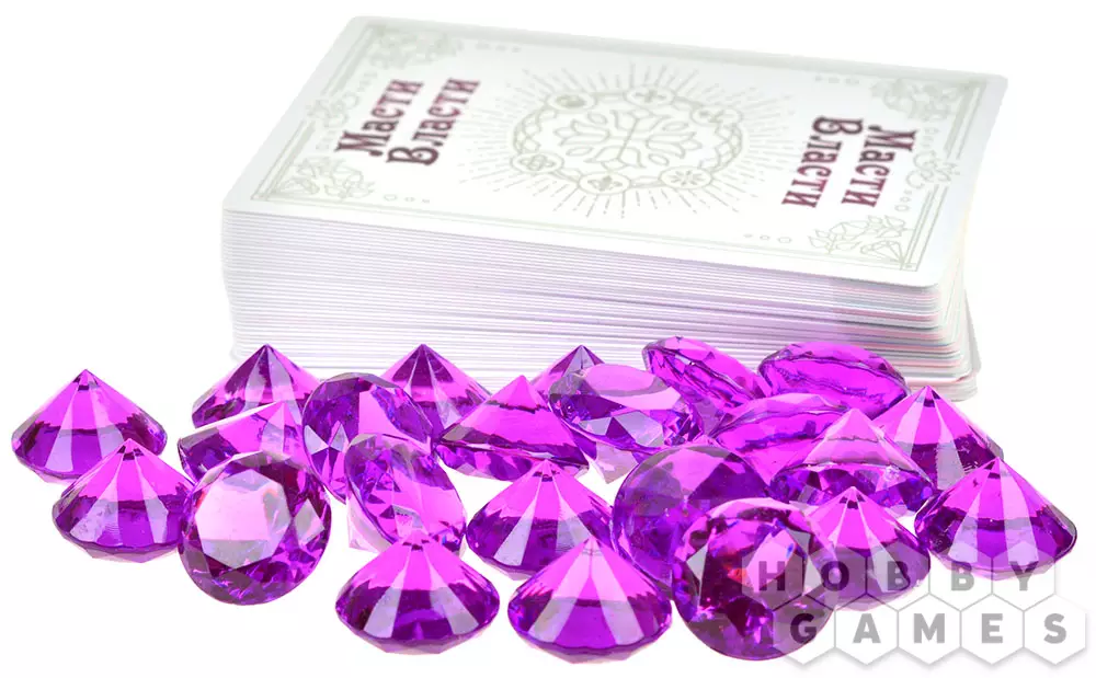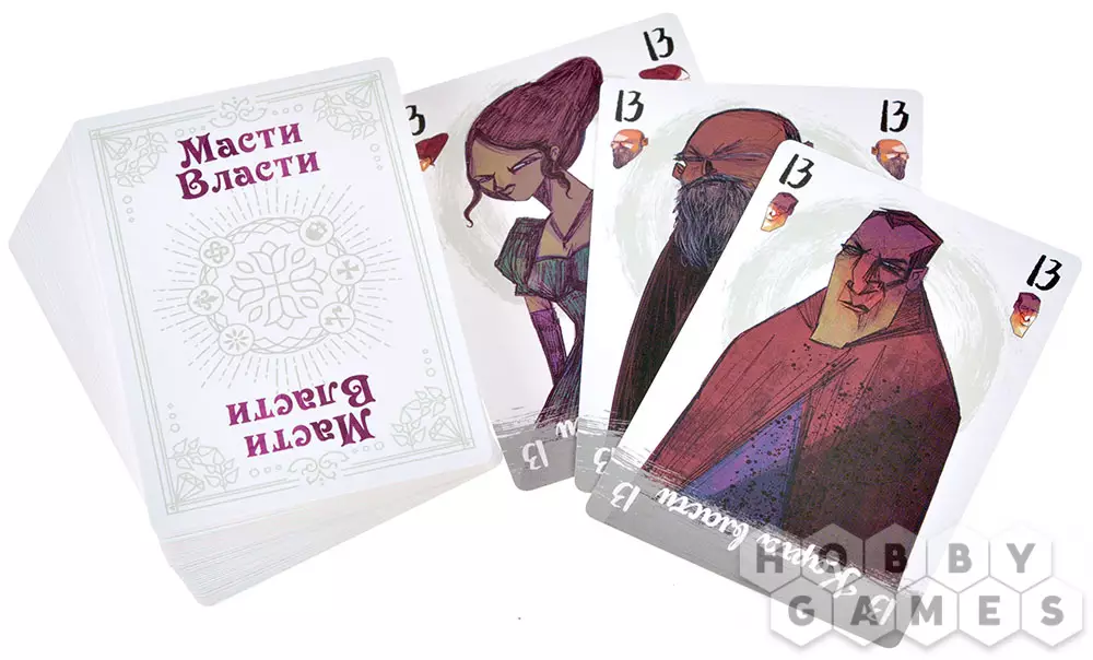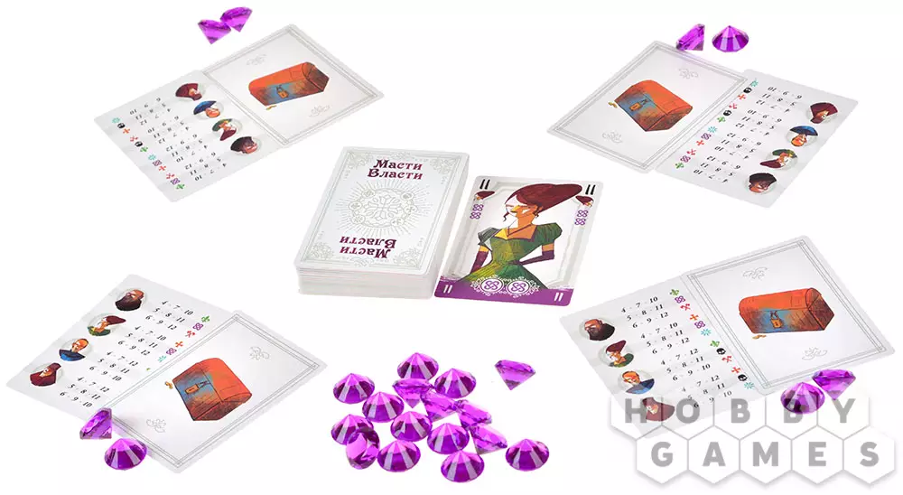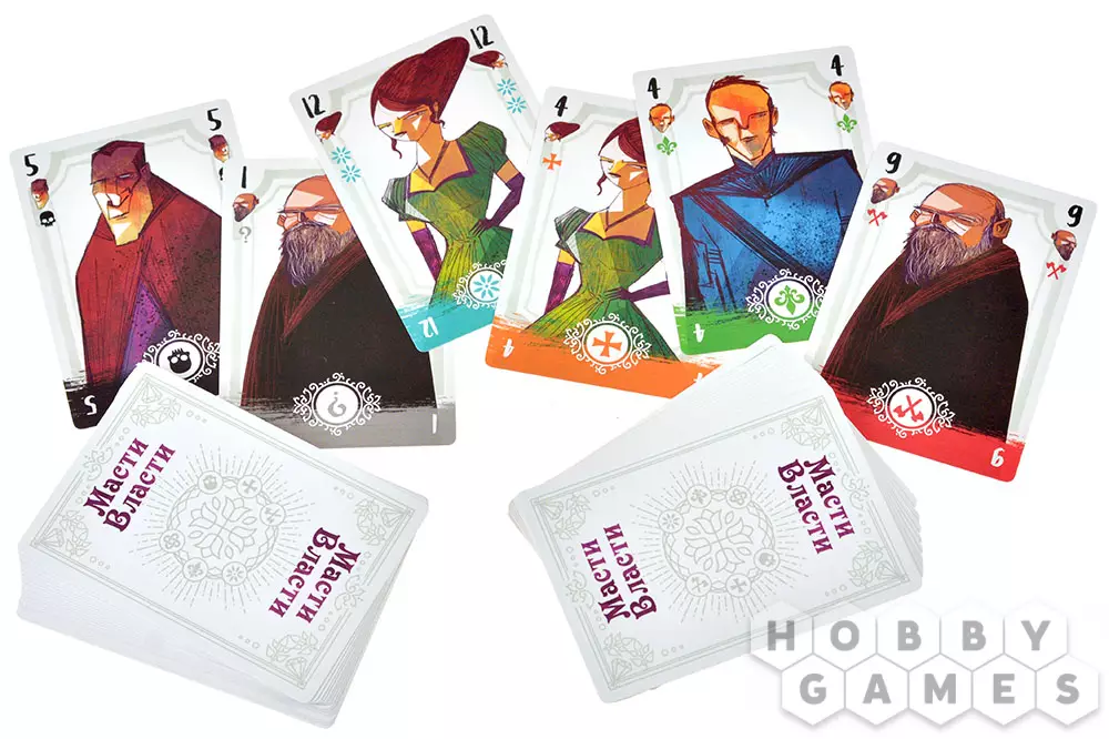 "Масти власти" – это карточная настольная игра, открывающая взгляд на игры со взятками под новым углом! Козыри меняются каждый раунд, а карты с самыми высокими рангами не всегда приносят пользу: да, они позволят вам забрать взятку, но ближе к концу игры могут лишить вас победных очков. Собирайте наборы символов различных гильдий, побеждая своих соперников и забирая у них карты. А если переживаете, что можете получить лишнего, то всегда можно откупиться самоцветами! Играйте, объединившись в команды, или соревнуйтесь каждый сам за себя. Приложите все усилия, чтобы завоевать благосклонность гильдий.