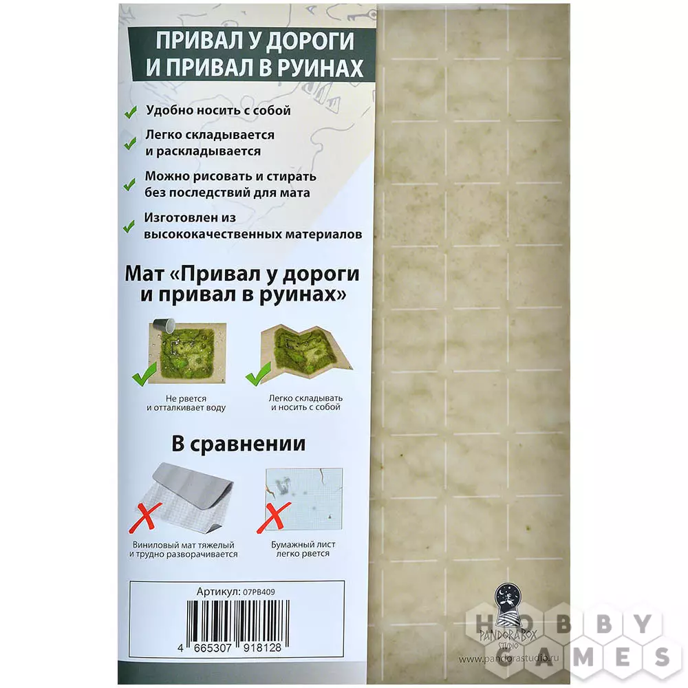 Этот игровой мат – отличное приспособление для настольных ролевых игр. Деталей ландшафта всегда будет недостаточно, и неплохой выход из этой ситуации – игровое поле, на котором можно нарисовать всё необходимое. Двухсторонняя ламинация мата не только защищает его от воздействия воды или грязи, но и позволяет бесследно стирать нарисованные неперманентным маркером схемы ландшафта. В разложенном виде размер игрового поля 22x28 дюймов, но для удобства транспортировки его легко сложить до формата А4.
