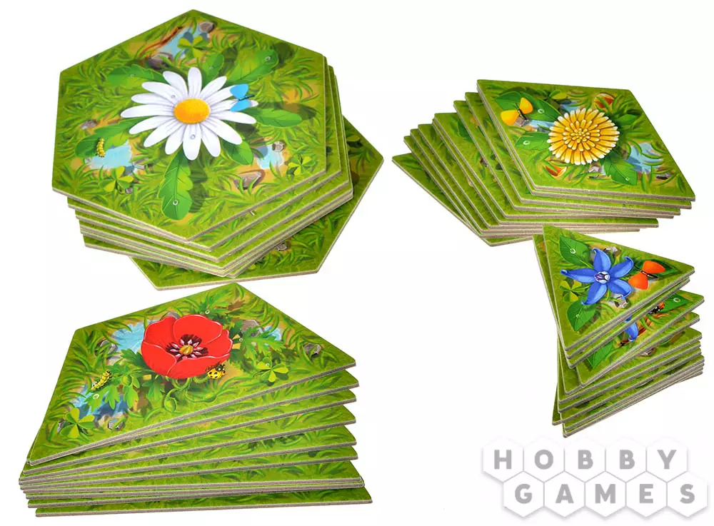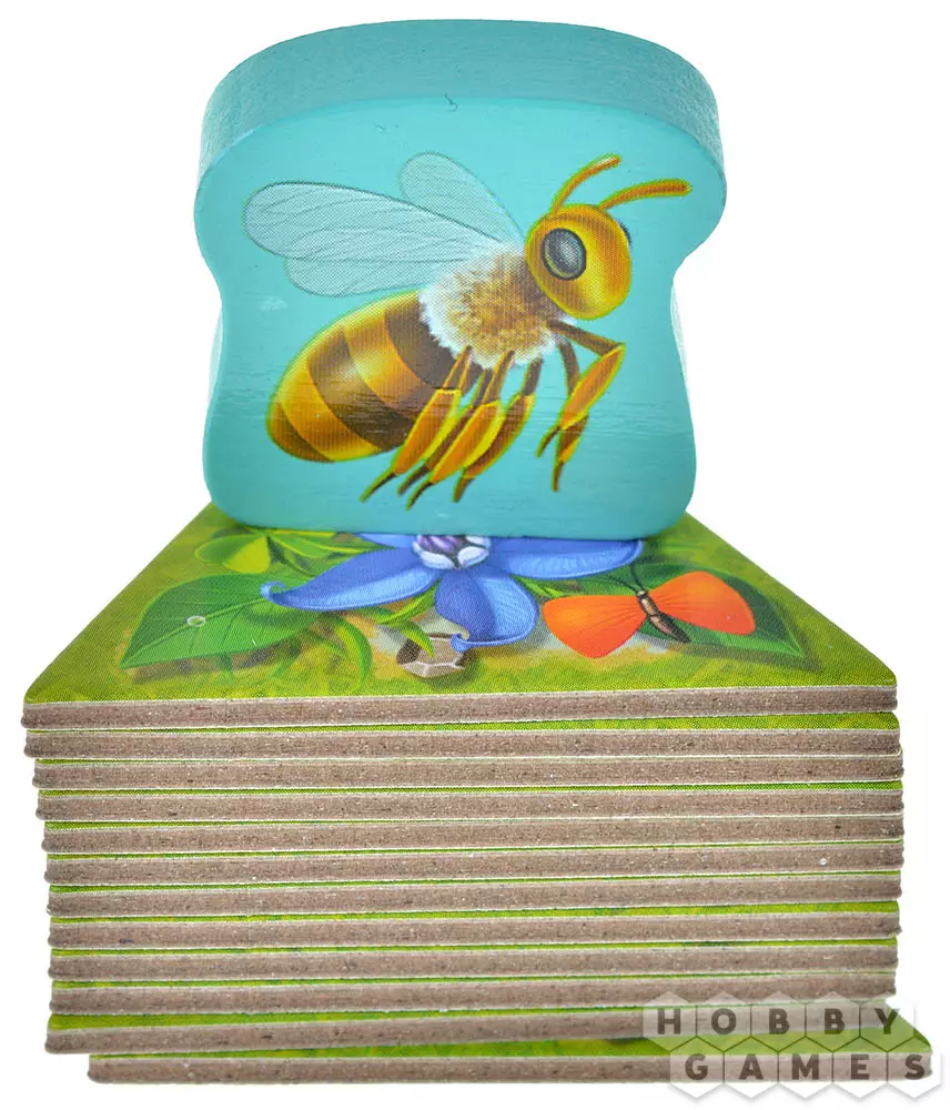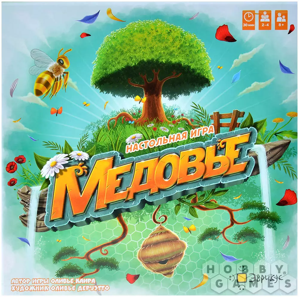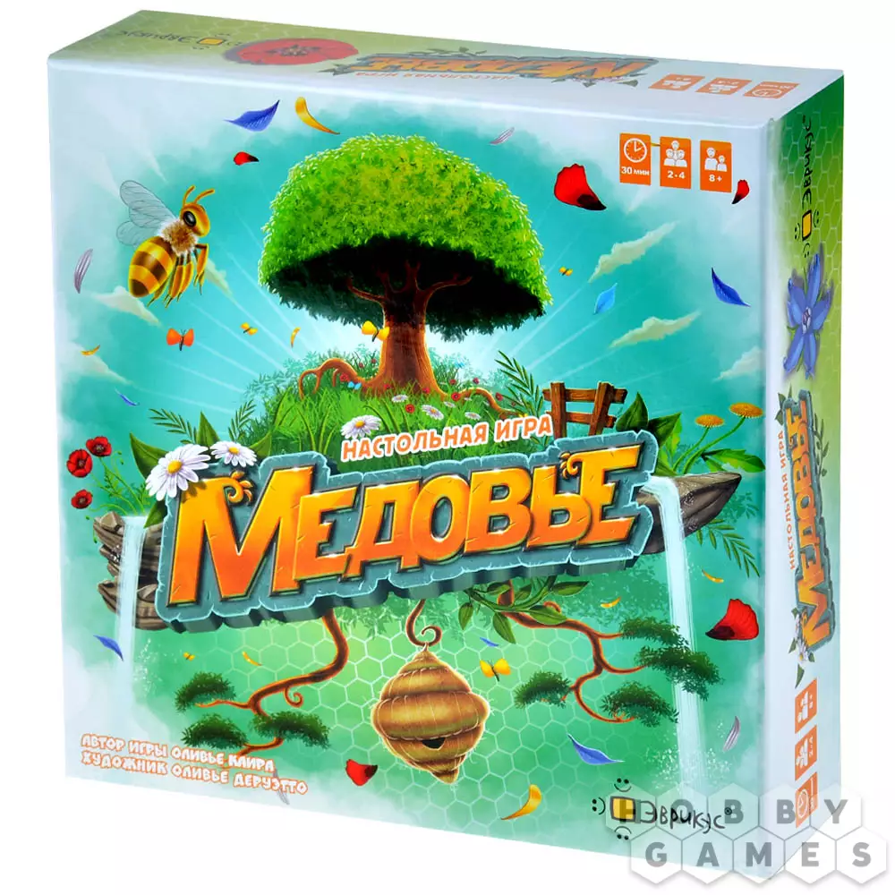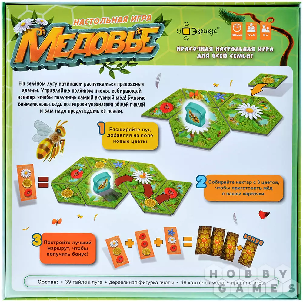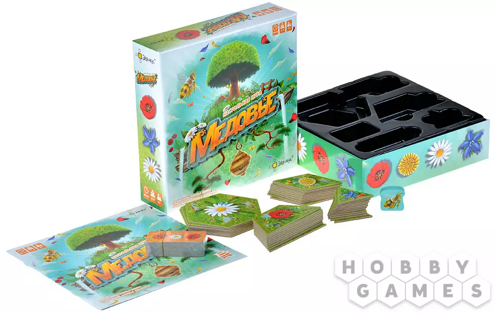 "Медовье" – это настольная игра, в которой игрокам предстоит управлять полётом пчелы по цветочному полю. Для начала это самое поле необходимо построить: игроки будут составлять его из тайлов различных форм, каждая из которых относится к конкретному виду цветка. В начале игры в центре стола расположен только один шестиугольный тайл с белым цветком. В свой ход игрок может выполнить одно из двух действий: расширить цветочное поле, выложив новый тайл с цветком на стол, или собрать нектар. Во втором случае нужно переместить пчелу последовательно по трём тайлам цветов, совпадающими с цветами на одной из карточек мёда игрока. Как только это удаётся сделать, карточка помещается в стопку готового мёда лицом вниз. Например: у вас есть карточка мёда, на которой изображены ромашка, мак и одуванчик. Вам нужно переместить пчелу именно по этим цветам и строго в том порядке, в котором они указаны на вашей карте. Только помните, что пчела перемещается только на соседние цветы, и на один и тот же дважды за полёт не садится. Да и зачем, там же уже не осталось нектара. После сбора игрок может выполнить это действие ещё два раза, после чего добирает на руку карты мёда, чтобы у него их снова было 3, и передаёт ход следующему игроку.