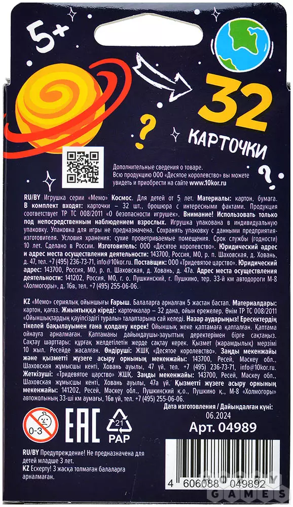 Всегда можно разнообразить игру и сыграть по другим правилам. Так, например, в брошюре с интересными фактами на заданную тему вы найдёте вариации игры "Мемори", "Кто быстрее" и "Падающая башня". А небольшой размер упаковки позволит с лёгкостью брать колоду с собой в дорогу.