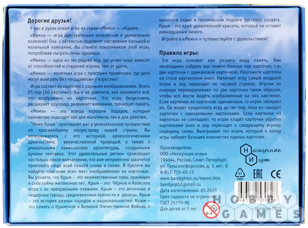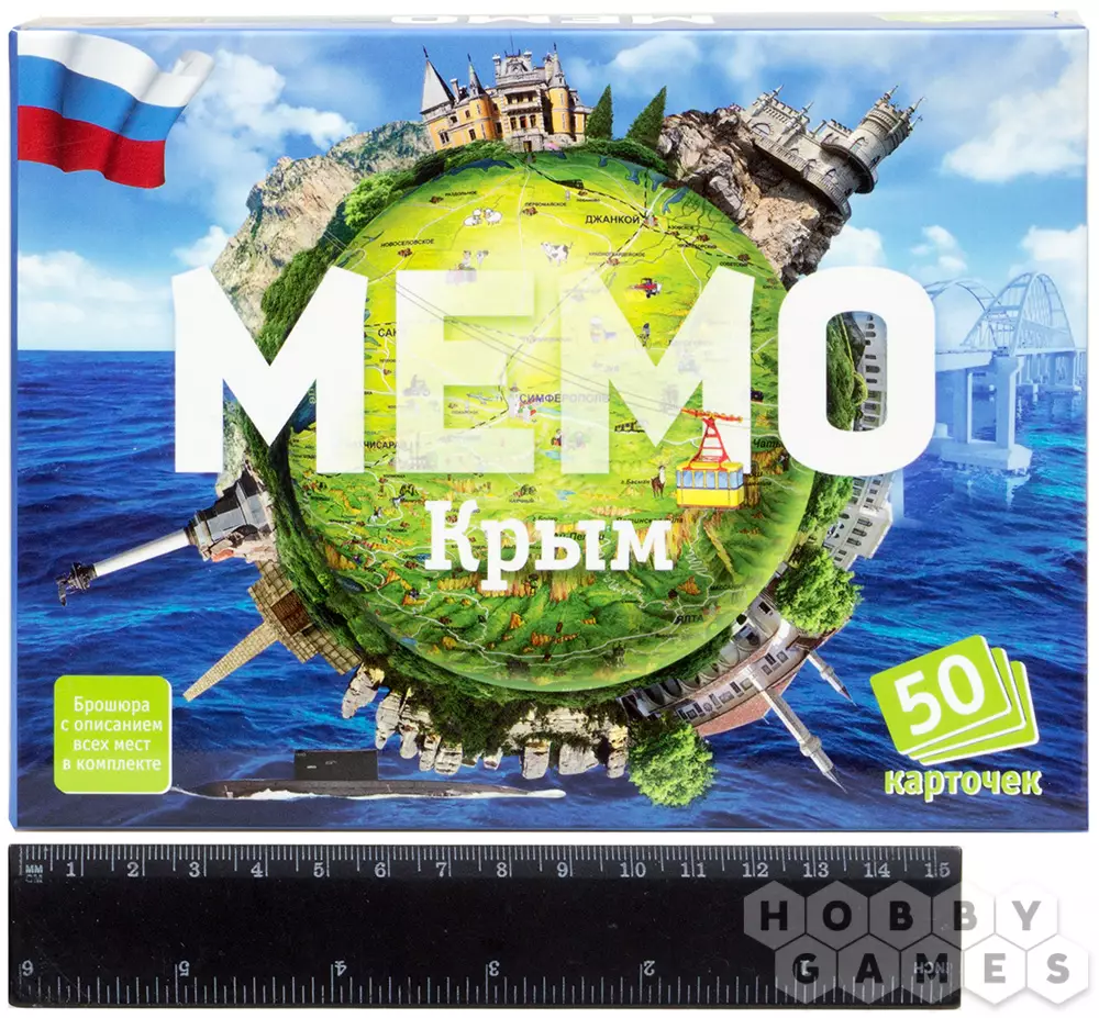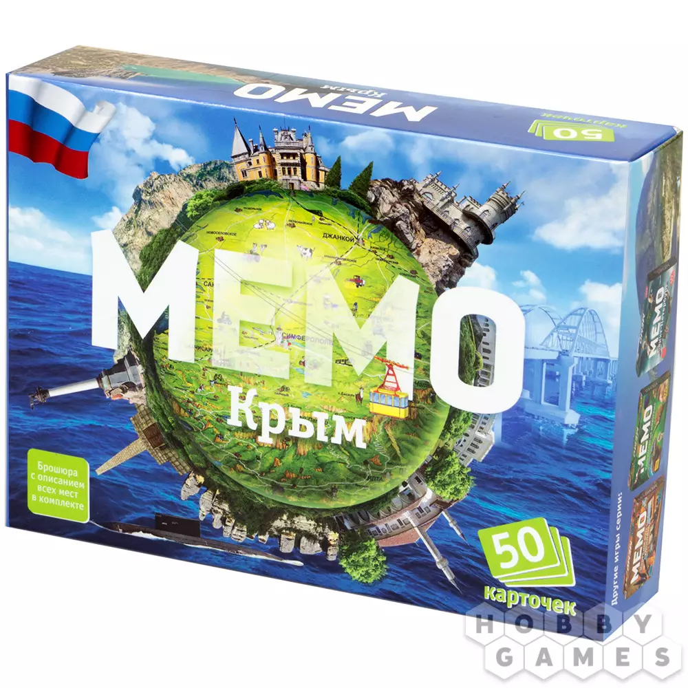 В игре "Мемо "Крым" вы найдёте парные карточки с изображением интересных мест, объектов и достопримечательностей красивейшего полуострова Крым. Ласточкино гнездо, Ливадийский дворец, Канатная дорога, долина Привидений и Царский курган – путешествуйте по региону прямо за игровым столом! Также в коробке вас ждёт брошюра с подробным описанием всего, что представлено в игре. История создания, интересные факты и многое другое – каждый сможет открыть для себя что-то новое!