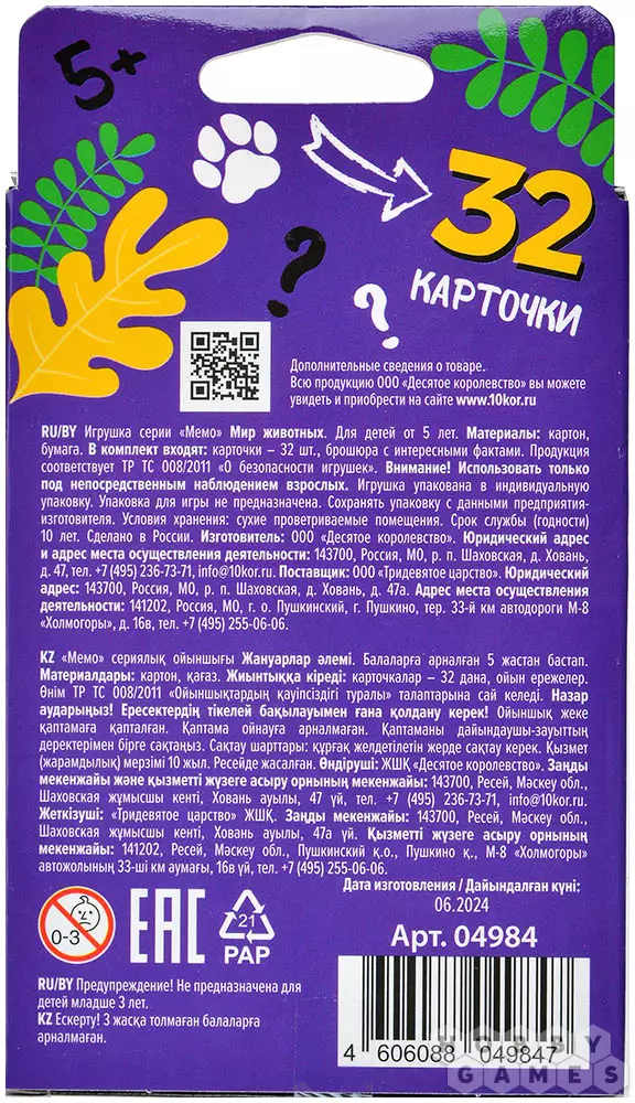 Всегда можно разнообразить игру и сыграть по другим правилам. Так, например, в брошюре с интересными фактами на заданную тему вы найдёте вариации игры "Мемори", "Кто быстрее" и "Падающая башня". А небольшой размер упаковки позволит с лёгкостью брать колоду с собой в дорогу.