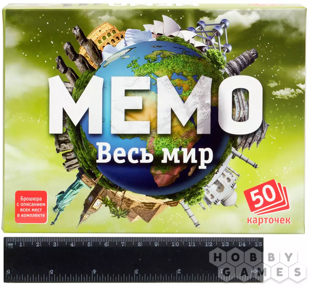 В игре "Мемо "Весь мир" вы найдёте парные карточки с изображением интересных мест и достопримечательностей со всего мира. Биг Бен, Собор Василия Блаженного, остров Пасхи, мост Риальто, Атомиум и замок Дракулы – путешествуйте прямо за игровым столом! Также в коробке вас ждёт брошюра с подробным описанием каждого представленного в игре объекта. История создания, интересные факты и многое другое – каждый сможет открыть для себя что-то новое!