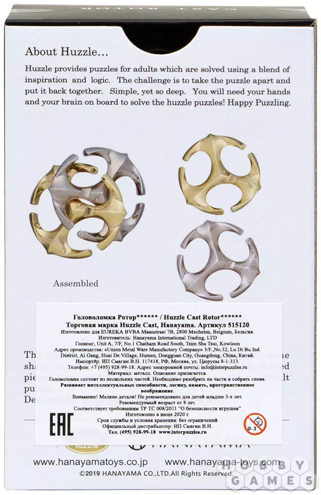 Линейка Huzzle Cast от японской компании Hanayama – это качественные металлические головоломки высокого уровня сложности, которые могут послужить отличным подарком как увлечённому фанату головоломок, так и просто человеку с пытливым умом. Чтобы решить головоломку, вам надо сначала разобрать её, а потом собрать. Причудливые формы и конструкции тщательно продуманы профессиональными создателями головоломок из стран всего мира и опираются на математические расчёты и законы физики.
