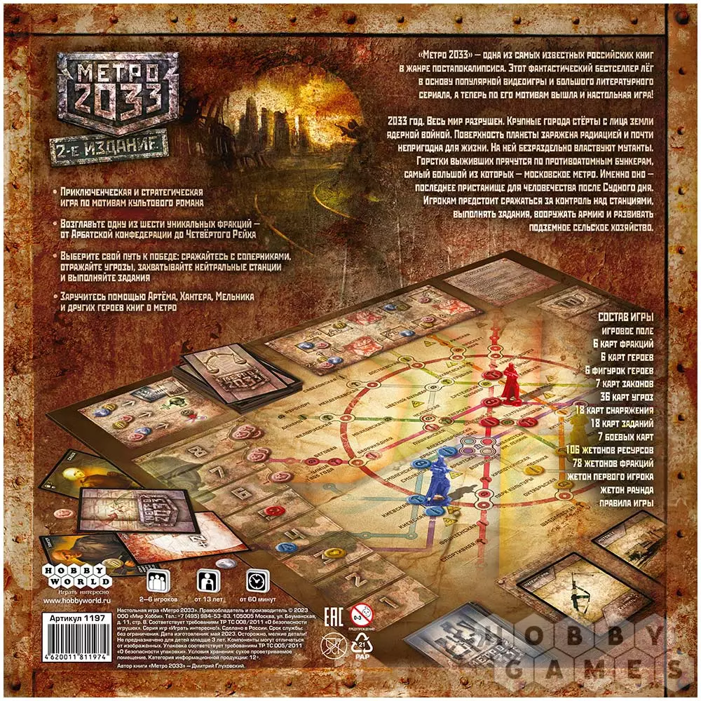Егор23.12.2023 14:35Игра по мотивам книги и компьютерной игры. Погружение и атмосфера достигается визуализацией и полем-картой МСК метро. В лет 14 в деревне играли в неё каждый день и буквально за лето уверенно могу сказать что играл раз 40. Сейчас 20 и до сих пор собираемся с друзьями поиграть. Если вы фанат фантастики и постапокалипсиса и любите динамику, то она вам точно пойдёт! -