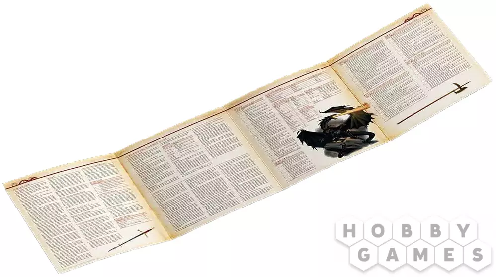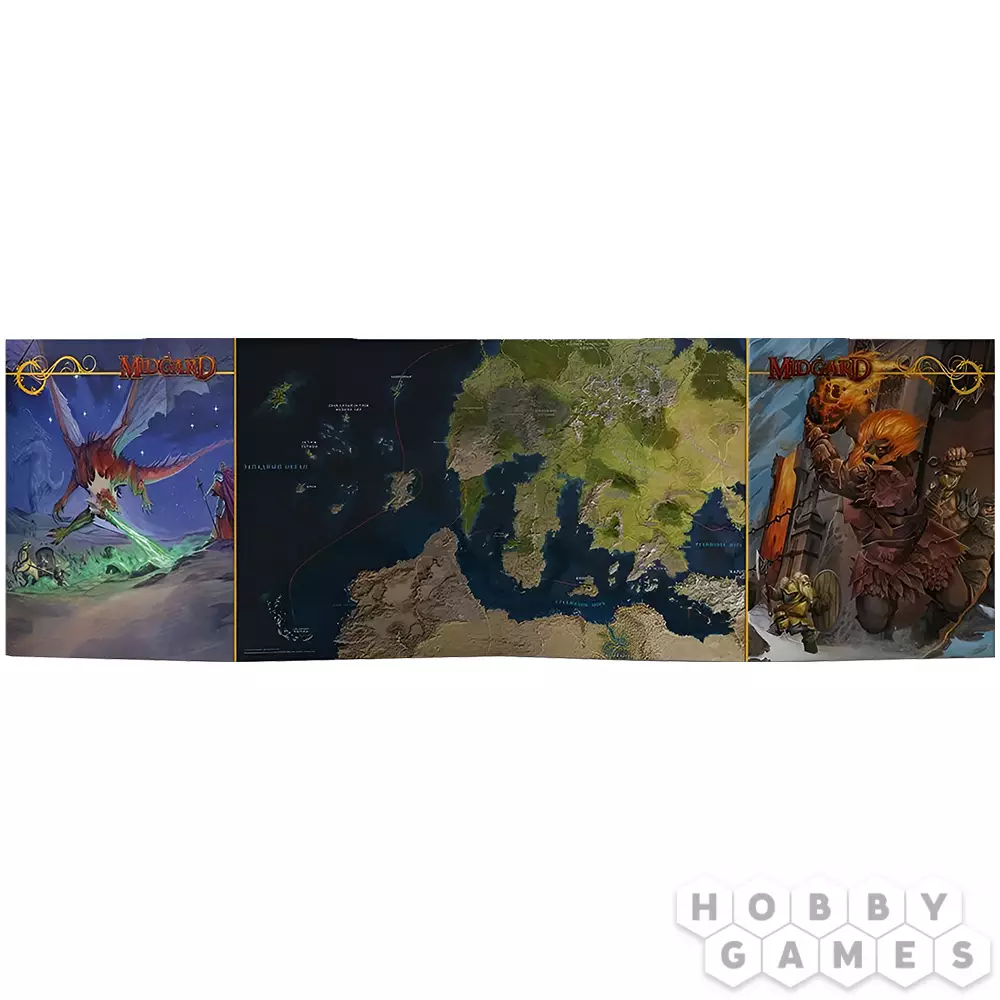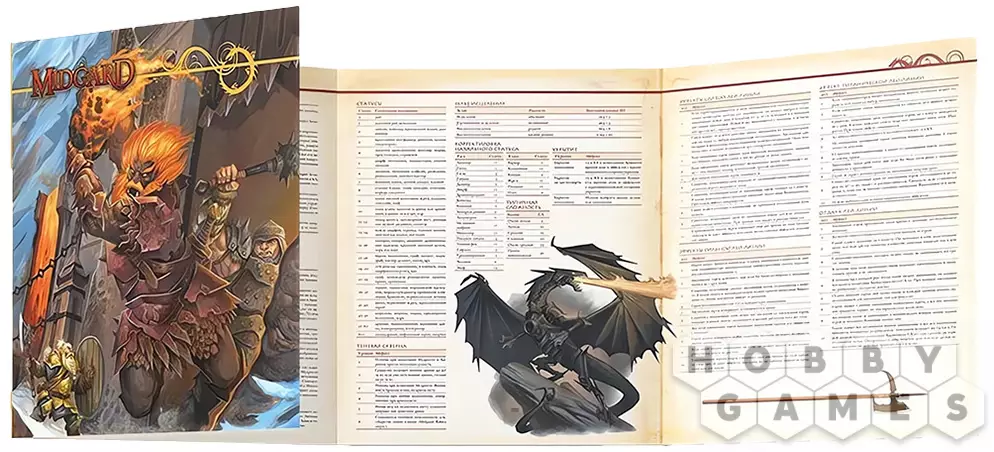 Ширма – крайне полезный инструмент как для ведущего, так и для игроков. Героям она позволяет вжиться в атмосферу мира, а гейм-мастеру – подсказывает в нужные моменты и позволяет прикрыть следы серой реальности (то есть всю его экипировку – например, листочки с пометками) за яркими, разноцветными картонными вратами во вселенную фэнтези. На внутренней стороны ширмы содержится информация по всем основным механикам сеттинга Мидгард – возможность уточнить спорные моменты без изучения сторонней информации позволяет сделать игру более комфортной.