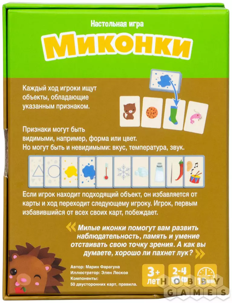 Цель игры – сопоставлять предметные карты с картами-признаками и объяснять свою точку зрения по этому поводу. В данном случае игрок выкладывает свою карту, и далее действует следующий ребёнок. Победителем окажется тот, кто первый останется без колоды. Сделайте процесс познания мира ребёнка ещё интереснее вместе с очаровательной игрой "Миконки"!