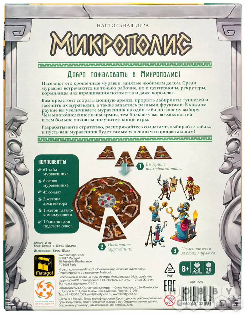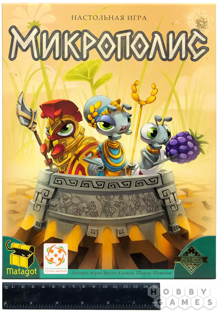 Постройте настоящую муравьиную ферму на своём столе с помощью настольной игры "Микрополис". Ферма не простая, а воинственная, ведь помимо обычных рабочих, в Ваших руках окажутся центурионы, которые станут костяком мощной захватнической армии. Даже королева муравьёв станет подвластна Вам, но придётся запастись кормильцами для взращивания будущих поколений муравьёв. Ройте лабиринты туннелей, заселяйте их новыми муравьями и запасайтесь питательными фруктами. Цель игры – построить огромный муравейник и получить за него как можно больше очков. Победные очки приносят: сильная армия, полные казармы и разные туннели.